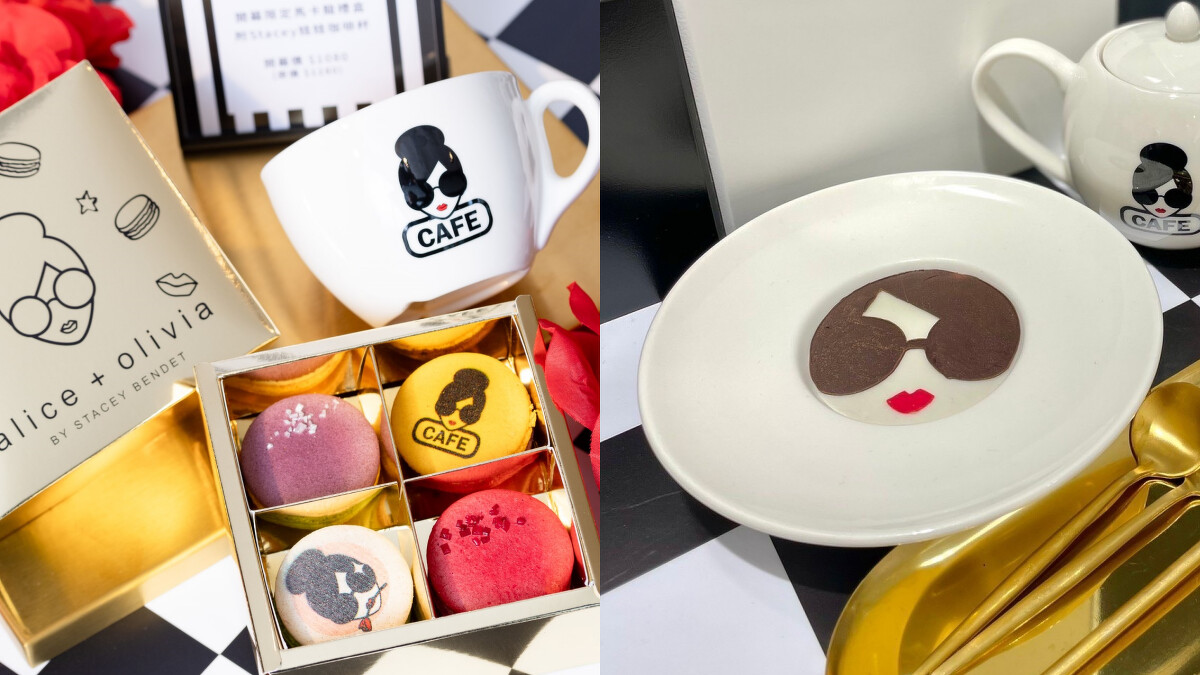alice + olivia café甜食部分由El Olor法式甜點主理人Nico毛湘云和甜點主廚Connie朱珮妮操刀,特別設計一款「Stacey敲敲巧克力—熱帶水果牛奶巧克力」,將慕斯與橙花晶凍融入當中,還可以俏皮用小錘子敲碎食用,並打造馬卡龍禮盒,內含玫瑰荔枝覆盆子、黃檸檬酸櫻桃、柚子等口味,更有品牌LOGO墨鏡娃娃,超適合當作送禮之選。