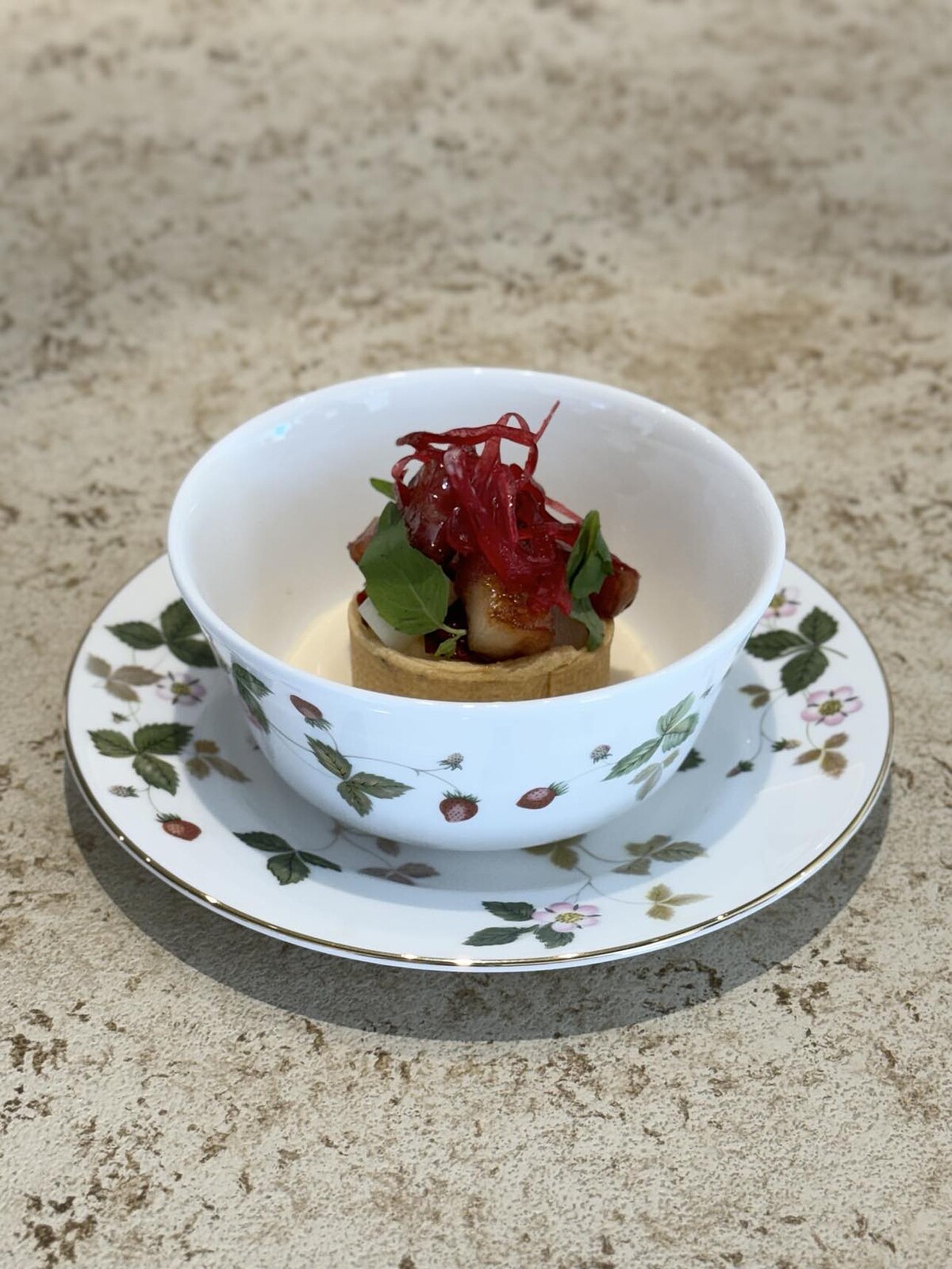 這次「栗林裏」選用的餐盤是Wedgwood野草莓Wild Strawberry、雋永白草莓以及杜鵑系列,將食材完美結合盤上的花卉圖騰,讓用餐體驗中增添典雅氛圍與故事性,在品嚐甜點之餘,宛如也同時欣賞藝術之作。