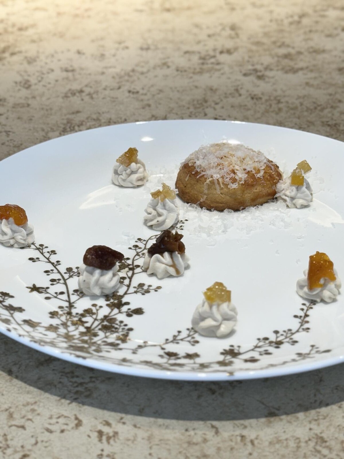 「胭脂紅」則是帶著鹹派靈魂重新詮釋,以烤布蕾方式製作而成,結合焦糖培根與手工醃製當季洛神花,甜鹹滋味在口中展現,而英式下午茶不能少的司康,主廚帶來「奶油茶」創新版本,沾上伯爵茶鮮奶油與酒漬果丁,鬆軟濕潤的口感讓人一吃就上癮。