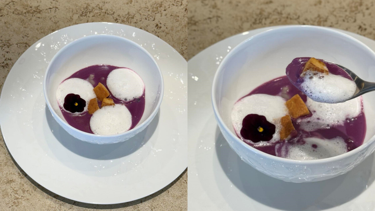 菜單中特別的還有「栗林裏」本季專屬的湯品料理「糯紫」,絕美的紫色調淋上薰衣草牛奶泡沫,讓視覺嗅覺都同步享受,可是最暖胃的甜蜜之作,接著來個獨創水果系三明治「橙黃色」,內餡包的是茂谷柑果凍與薑味卡士達醬,宛如來了一場餐桌上的野餐。