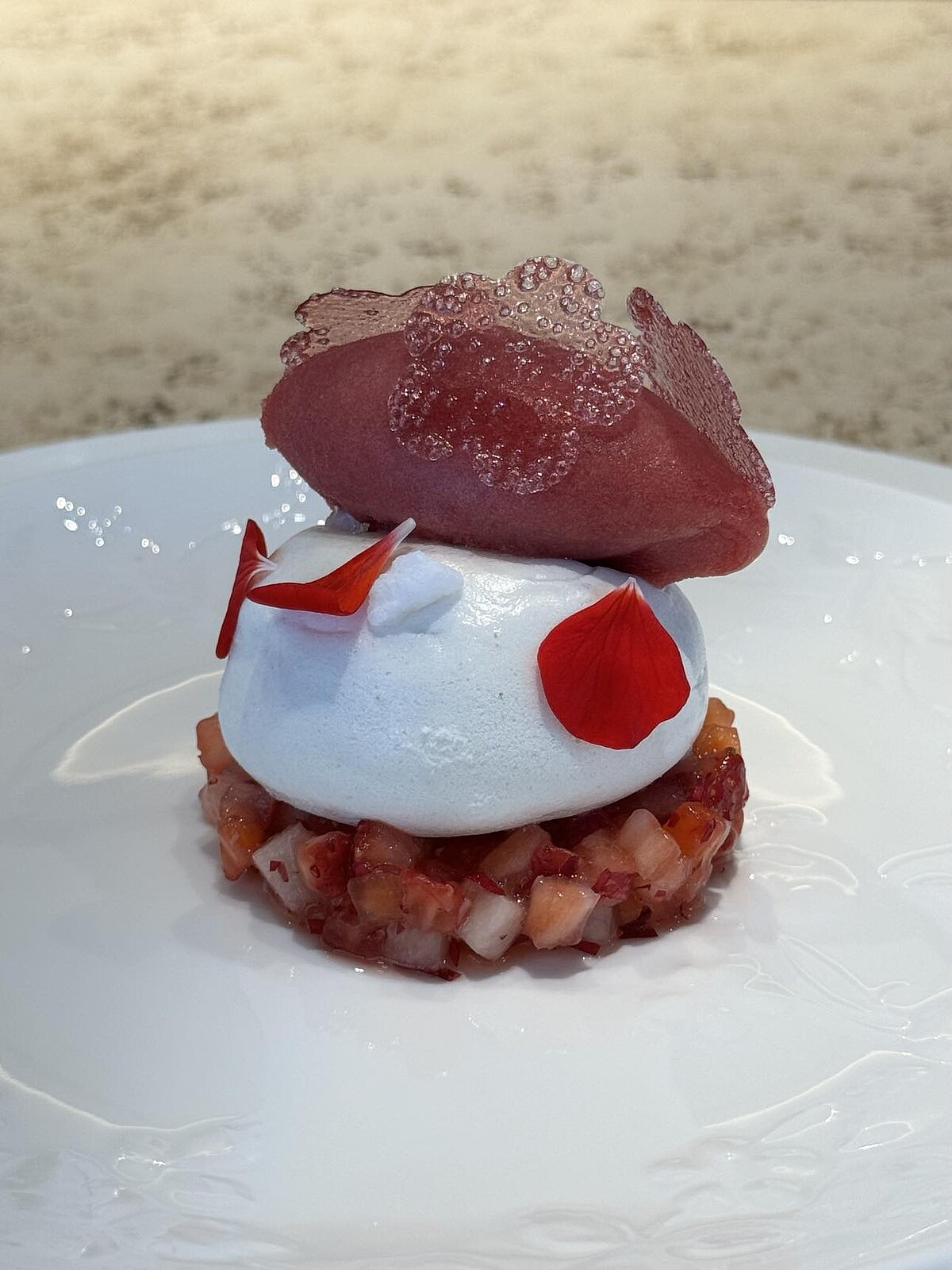 另外迎合這次的草莓季主軸,「莓瑰紫」即是以塔派作為結尾,用蛋白霜取代蛋糕體,盛裝現作的巨峰葡萄果醬,搭配底部的新鮮草莓蓮霧丁,在白草莓骨瓷盤上,可是套餐中最夢幻的ending。
