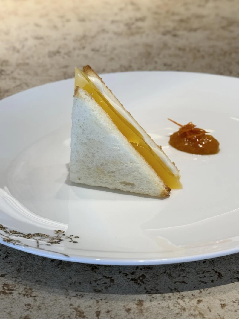 菜單中特別的還有「栗林裏」本季專屬的湯品料理「糯紫」,絕美的紫色調淋上薰衣草牛奶泡沫,讓視覺嗅覺都同步享受,可是最暖胃的甜蜜之作,接著來個獨創水果系三明治「橙黃色」,內餡包的是茂谷柑果凍與薑味卡士達醬,宛如來了一場餐桌上的野餐。