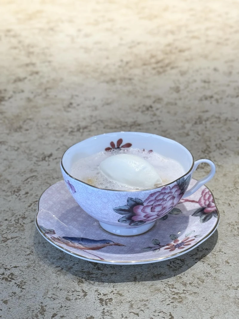 「栗林裏」攜手Wedgwood的聯名冬季套餐,將英式經典下午茶概念和台灣冬季當地食材融合,從開胃小點、前菜、主菜、甜點到餐後茶點通通富有巧思,套餐一共有8道,首先開胃菜「豆綠」將筊白筍以生魚片形式呈現,擠上清爽的優格醬,並搭配毛豆冰淇淋,是令人驚喜的味蕾開場。