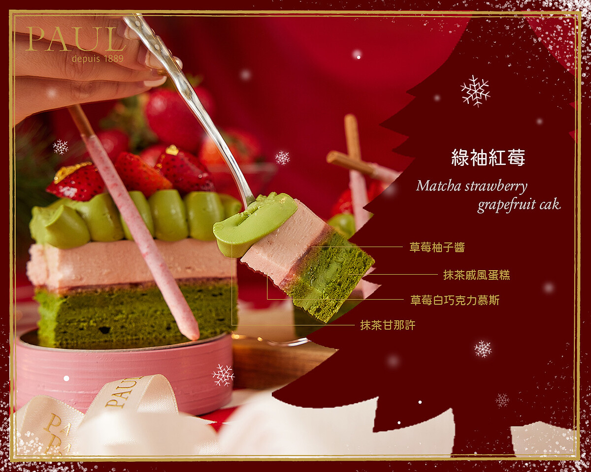 PAUL今年的樹幹蛋糕-「綠柚紅莓」更為創新,「從蛋糕側邊就能看出各個層次,整體風味以日本小山園抹茶、草莓柚子醬、草莓白巧克力慕斯交織而成,清爽口感柔軟扎實,層層堆疊的風味,每一次咀嚼都叫人感到驚喜!