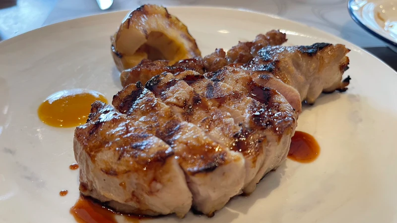 採用來自台灣的頂級究好豬,選用帶骨里肌部位,先以直火煎烤;搭配以奶油糖烤過,再以乾煎誘發香氣的蘋果,最後淋上以豬骨、白蘭地與奧勒岡州蔓越莓濃縮汁熬煮的酸甜醬。