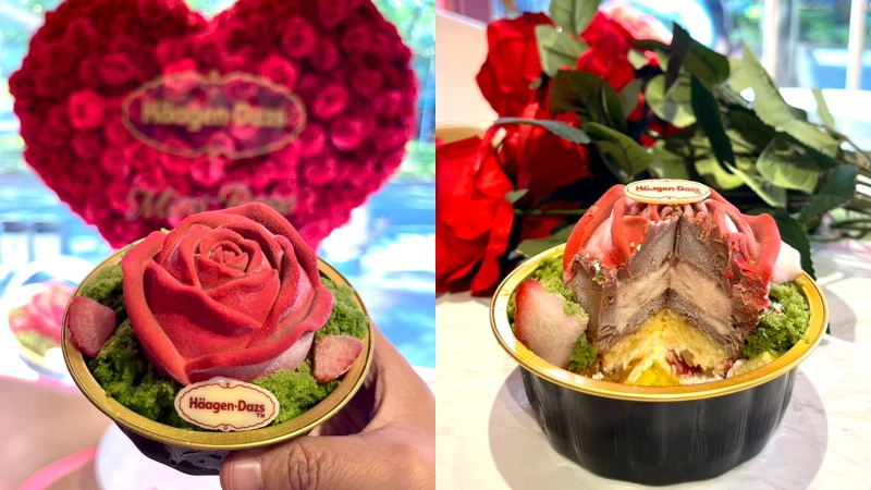 哈根達斯以紅玫瑰為靈感,打造細緻擬真的「掌心玫瑰」,將檸檬乳酪巧克力甘納許化作絲滑花瓣,層層包裹酸甜的草莓冰淇淋,四周佐以抹茶海綿蛋糕與少許新鮮草莓切片點綴,營造以掌心玫瑰為中心的花園意象。