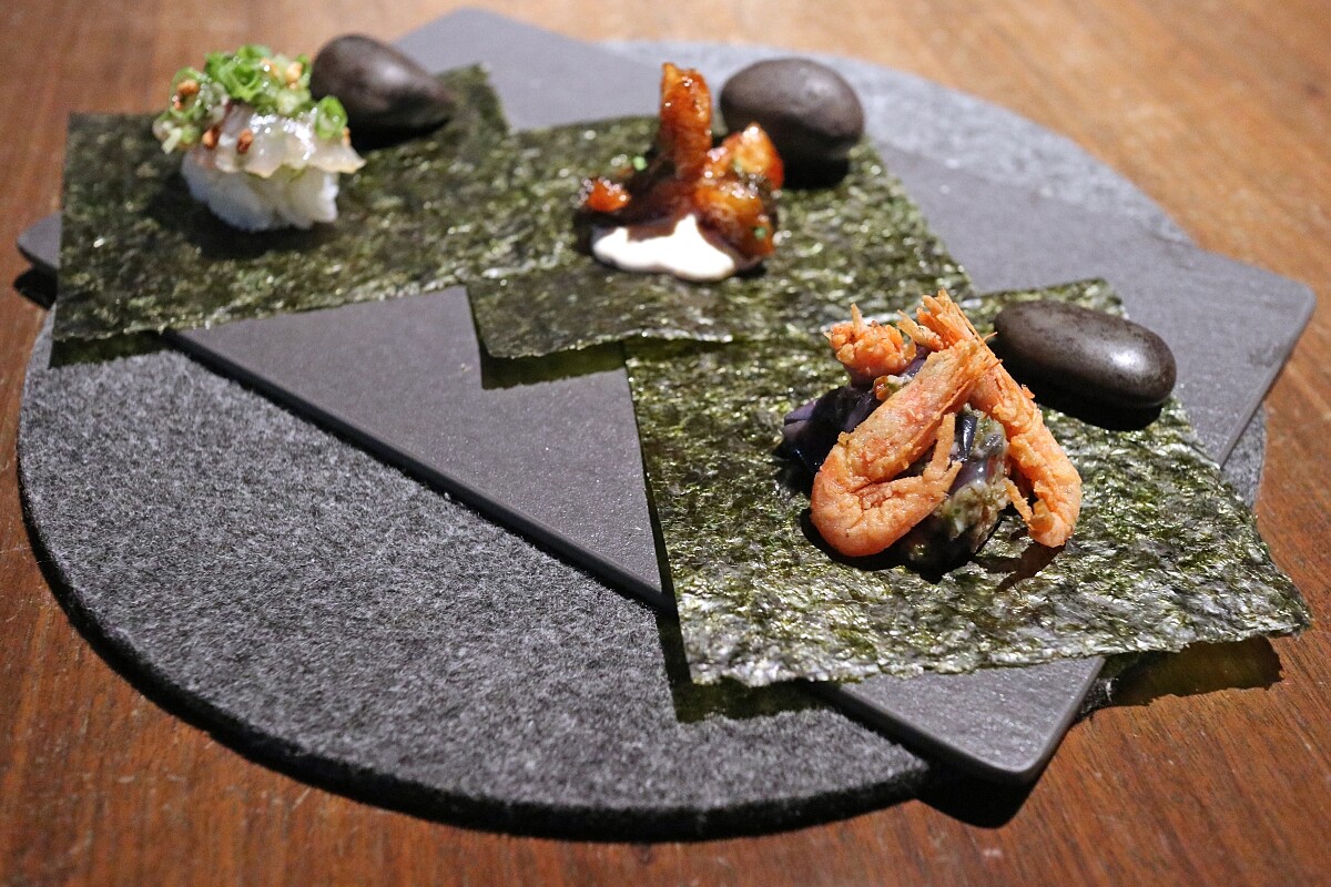 第一道料理重現回遊的青森人的樣貌,Chef Andre 認為他們除了帶有各自的特色,也挾帶了一點從異地而來的氣氛。每一個散壽司分別代表了三個人,第一個就是宮下宗一郎知事,主廚以來自紐約的起司蛋糕,搭配上烤鰻魚,說明了過去與洄游後的身份;貴乃家姐弟經營一間位於八戶市的居酒屋,Chef Andre 品嚐過店內供應一道有著熟悉的蔥油風味的竹莢魚料理,因此留下深刻的記憶,特別做了轉譯致敬;而最後一道以看似溪蝦卻是飄洋過的海蝦搭配上濕軟的茄子,則代表了 Chef 本人,也隱喻了同樣洄游返鄉的經歷。