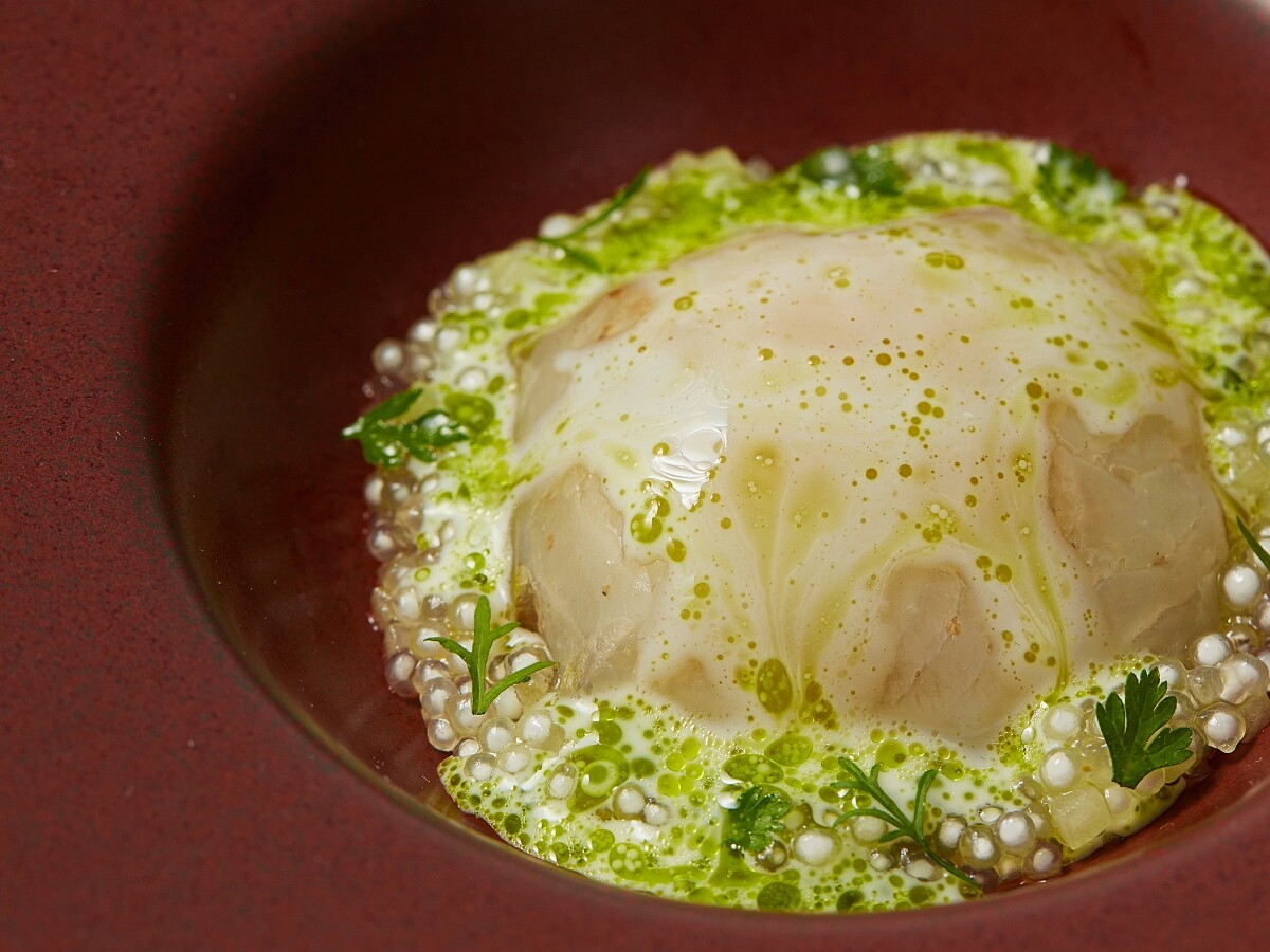 菜色部分 Chef Andre 特地使用馬鈴薯絲、菊芋絲和筍絲三種帶有土壤風味的秋冬食材,並選用底棲性的魚類—比目魚(鮃)作為呼應,主廚將其醃漬入味後覆上晶瑩剔透的如果凍般的表皮,疊放在蔬菜絲上,最後淋上青花椒、奶油、雞高湯製作而成的醬汁,多種口感質地搭配下,卻又帶有一絲異國風情。