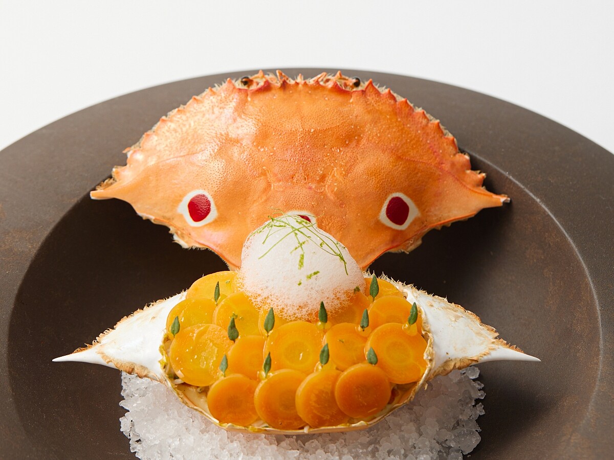 花田 秀樹為青森市「花秀 Kashu」餐廳的主廚,過去曾在東京米其林二星 Esquisse 餐廳服務。花田主廚認為最能代表青森的料理為「帆立貝燒」,那是一道利用帆立貝裝載炒蛋、蔬菜、帆立貝最後焗烤入味的菜品。由於帆立貝非當季食材,Chef Andre 則選以三點蟹替代,用一樣的做法呈現,以蟹殼裝載炒蛋、蔬菜、蟹肉,以相同濃郁的風味作為致敬。