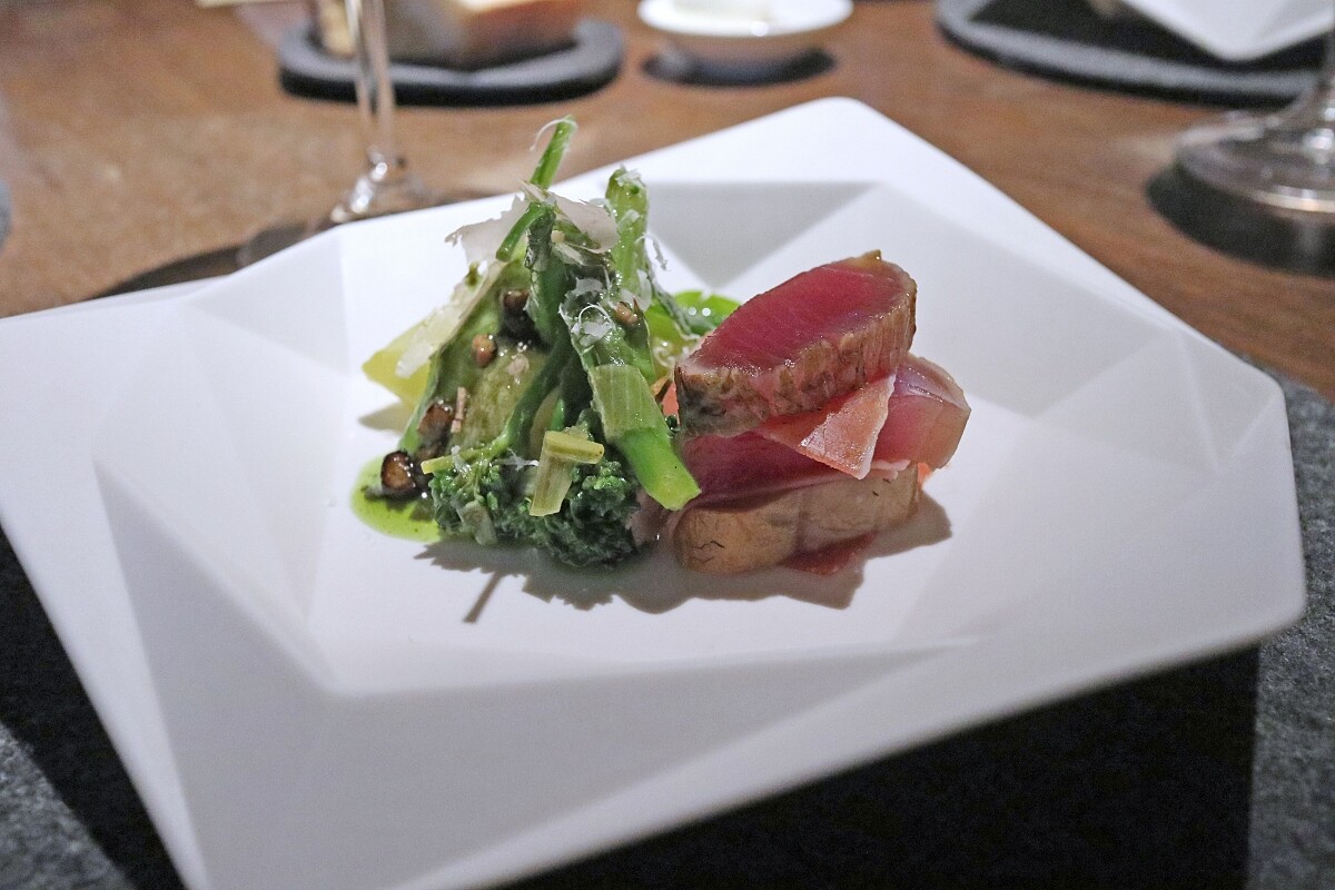 主菜靈感來自金木町的法料主廚花田秀樹在一次訪談中聊到最想念的家鄉味為「高菜馬肉」,在物產相對貧瘠的金木町,馬肉是最為知名的食材,通常會搭配上類似台灣梅乾菜的「高菜」一起燉煮享用。