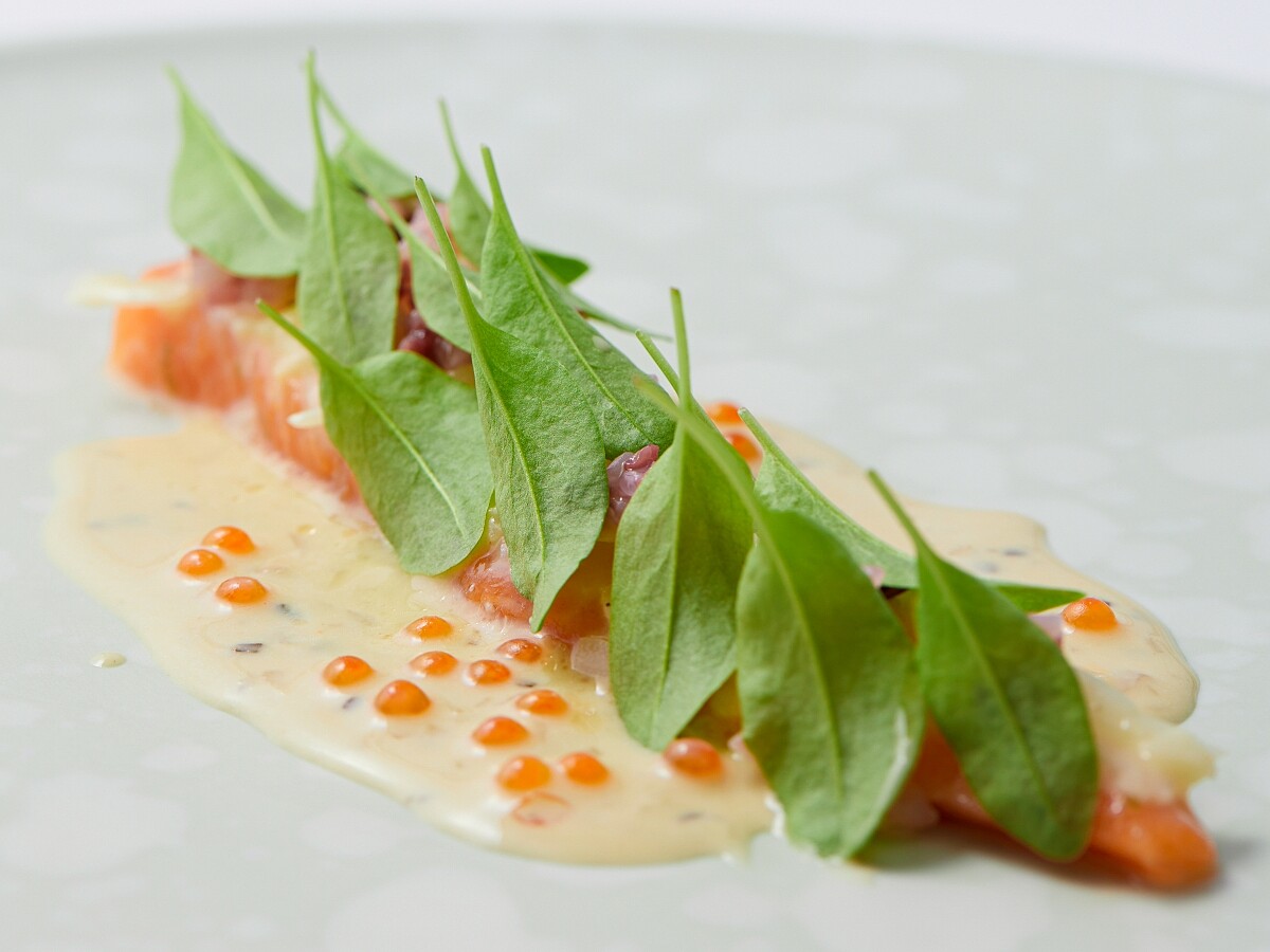 此次唯一拜訪的食材生產者為來自大畑町的濱田 勇一郎先生,「津青海峽鮭」,是唯一在津青海峽上養殖的鮭魚,因為水流湍急,讓鮭魚呈現類似野生的狀態,因此肉質相當緊實,Chef Andre 為此感到相當驚艷!料理則以當時在陸奧市「agréable」餐廳品嚐到的料理為原型,竹川主廚以津輕地區當地特色料理「壽司子」搭配津青海峽鮭,發酵的米粒獨特的口感清爽的風味,與油脂豐厚的鮭魚相得益彰,因此 Chef Andre 特地在青森週還原整個菜品的樣貌,並加上秋天盛產的百合、淋上法式奶油芥末醬。
