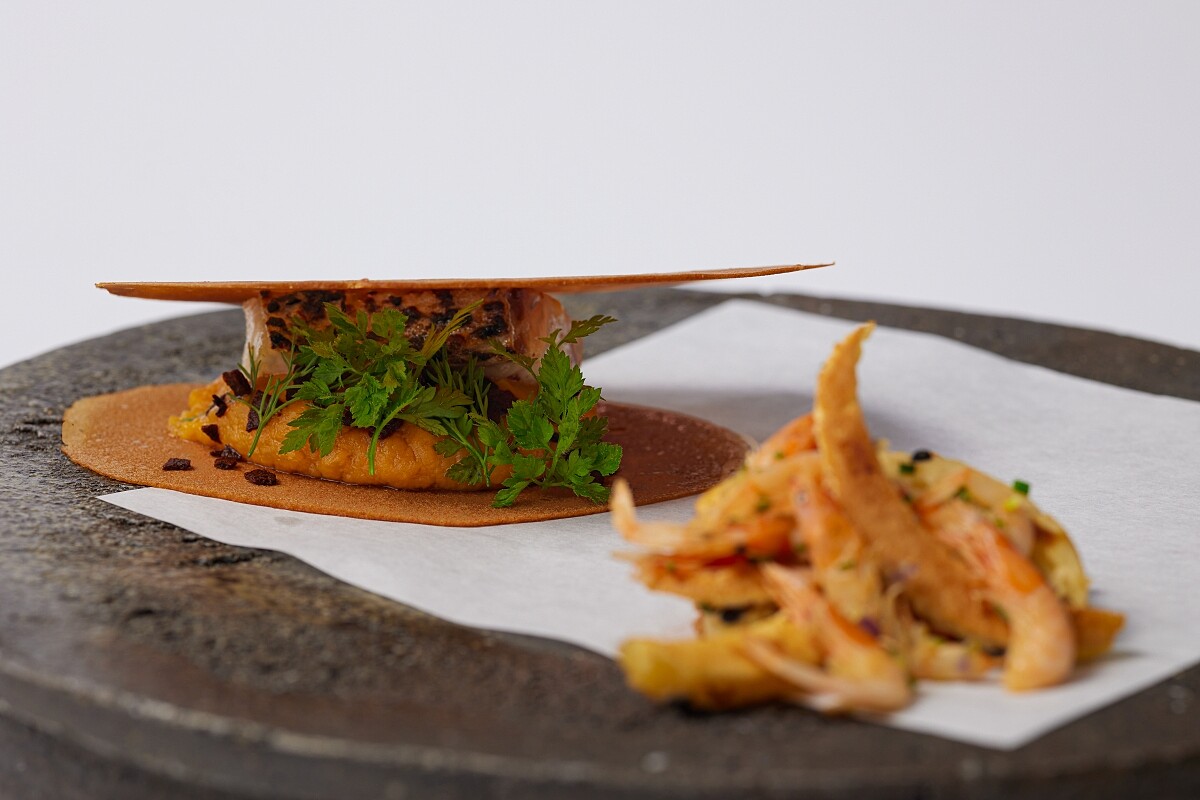 Chef Andre 如法泡製,將修剪的鯛魚燒外皮保留下來,與櫻花蝦拌炒,內餡則有包裹著煎製的雕魚肉,將白仙貝之於「耳朵」、鯛魚燒與鯛魚的關係表現在料理中。