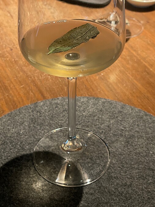 取用紫蘇、紅蘿蔔、嫩薑等風味,調配的無酒精調飲,上頭則有紫蘇做成的餃子,內餡以青蘋果泥,草本風味平衡了鯖魚料理濃郁的氣味。