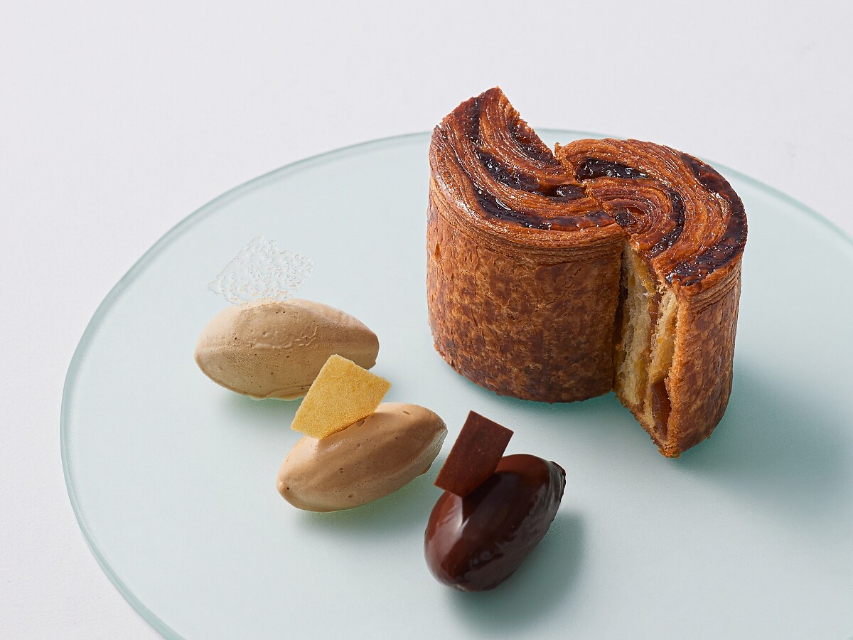 原本不在此次計畫拜訪的弘前市,Chef Andre 行前發現當地有蘋果派比賽盛典,因此特地安排了前五名店家踩點探店。 於是 Chef Andre 在「青森週」隔空參賽!他以三種不同法式手法呈現,運用製作千層派、翻轉蘋果派、肉桂麵包的技巧合而為一,搭配上巧克威士忌力甘納許、咖啡鮮奶油、焙茶冰淇淋,點綴上透明的糖片作為搭配,作為餐會最甜美的結尾。