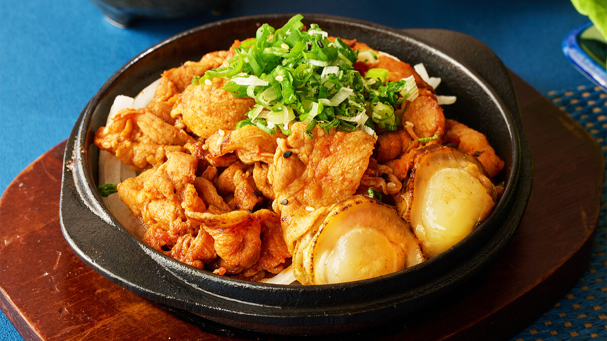 韓式風味代表「糯米辣椒醬」 派出「韓風燒肉禦膳」採用韓國道地的糯米辣醬爆炒豬五花肉片與香煎青森扇貝,熱鐵板底部鋪上滿滿的新鮮洋蔥,香味四溢,選搭配多種吃法的韓定食標配,包括生菜、麻油海苔、柚香蘿蔔與泡菜。