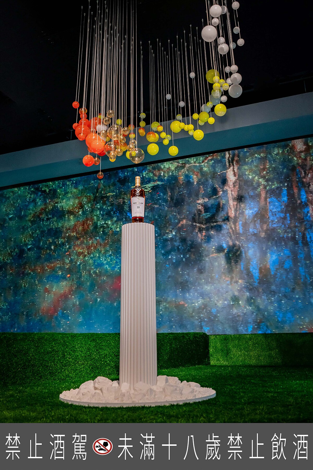 展區「香韻悠沁」可見春池玻璃手工吹製的120顆沾色玻璃,以螺旋狀向外延展,呈現出酒香在空氣中優雅舞動之姿,其咖啡色、橘色、黃色、白色的色調主體,呼應的是麥卡倫酒款中太妃糖、焦糖、柑橘、檸檬、麝香葡萄等風味,將風味的無形之美具體成形,讓觀展者在作品前感受一場視覺與味覺的綺麗交織,詮釋麥卡倫優雅細膩的印象風味。