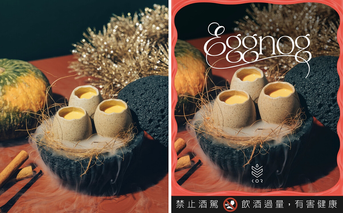 每到歲末年終溫馨的耶誕季節,都少不了這款經典的蛋酒,運用別具特色的鳥巢蛋殼器皿呈現,結合掀蓋後滿溢寒冷雪意煙霧的聖誕氛圍,喝上這款濃郁溫熱的升級版特調蛋酒,讓 KOR 帶給你意想不到的全新秋冬驚喜。