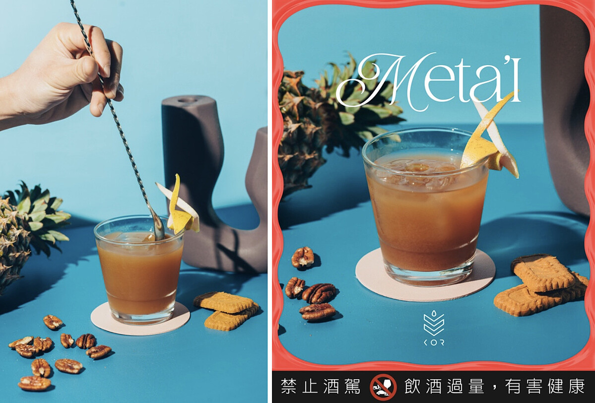 Meta’I 一名來自 “Meta (超越)” 與大溪地語 “Maita’i(很好)” 的結合,用杏仁甜酒替代經典元素,加入鮮搾鳳梨汁增添酸甜果香,並有火烤後的鳳梨鹹鮮奶油香增加風味層次,再使用烘烤後的胡桃將濃郁堅果鹹香浸入充滿蘋果肉桂、香蕉煎餅味道的 69% 高濃度黑蘭姆酒,而椰子花蜜糖則延展了煙燻焦香,黑可可苦精則勾勒出深度大人感的苦甜輪廓。運用了桶陳蘭姆酒富含的焦糖、太妃糖、龍眼蜜、柳橙與烤橡木香氣,最後與 Lotus 焦糖脆餅醬舒肥浸漬,澄清出由甜膩蛻變成細緻的香醇尾韻,讓整體呈現充滿層次且意想不到的明亮口感。