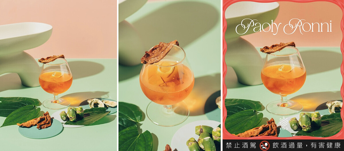 Paoly Ronni 是翻轉經典調酒 Negroni 的藝術之作,跨越了東西方文化的交匯,創造出極具深度的味覺饗宴。Infused 苦瓜結合艾普羅香甜酒替代原有傳統成分,不僅保留了原有的深邃苦味,更添加了獨特的鮮甜尾韻。同時再注入大膽強烈的檳榔老葉與保力達風味,取代了原本的草本調性,賦予了酒品前所未有的特殊香氣和口感。苦與甜交織的豐厚層次,獻給成熟而內斂的品味家。
