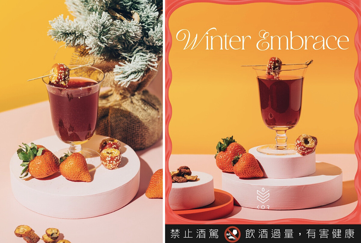 以古早味傳統小吃冰糖葫蘆做為發想,使用 KOR 自製伯爵茶高粱,再加入當季草莓、山楂的酸甜果香,高粱的獨特酒香結合人們心中道地的夜市小吃,在寒冷的冬天喝上一杯熱熱的 Winter Embrace,有如被人擁入懷中一樣充滿暖意。