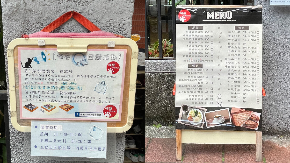 「喵屋 Meow 輕食餐廳」的老闆娘是一對母女,原本是愛狗人士的2人7年前在路上撿到浪貓,才開啟了她們的愛貓之旅,再加上疫情期間被放無薪假,她們才在因緣際會之下開了一間寵物咖啡廳。闆娘透露店內的貓咪都是浪浪,曾經成功送養出2隻貓咪,但現在因為不方便做家訪,所以現在已經暫停送養,如果有客人上門詢問是否能領養貓咪,她們就會積極介紹動物之家,希望更多無家可歸的毛小孩能夠找到一輩子的寄託。