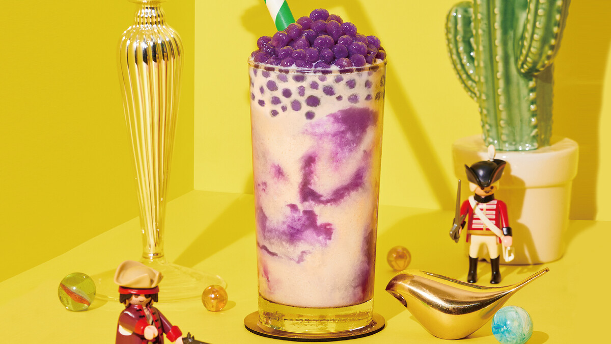 以甜蜜芋頭冰沙為基底,紫薯泥夢幻漸層刮壁,加入綿密香甜芋泥與獨家專利小紫芋,Q彈紫薯珍珠與綿密細緻冰沙口感,網美拍照人手一杯最強打卡神器。