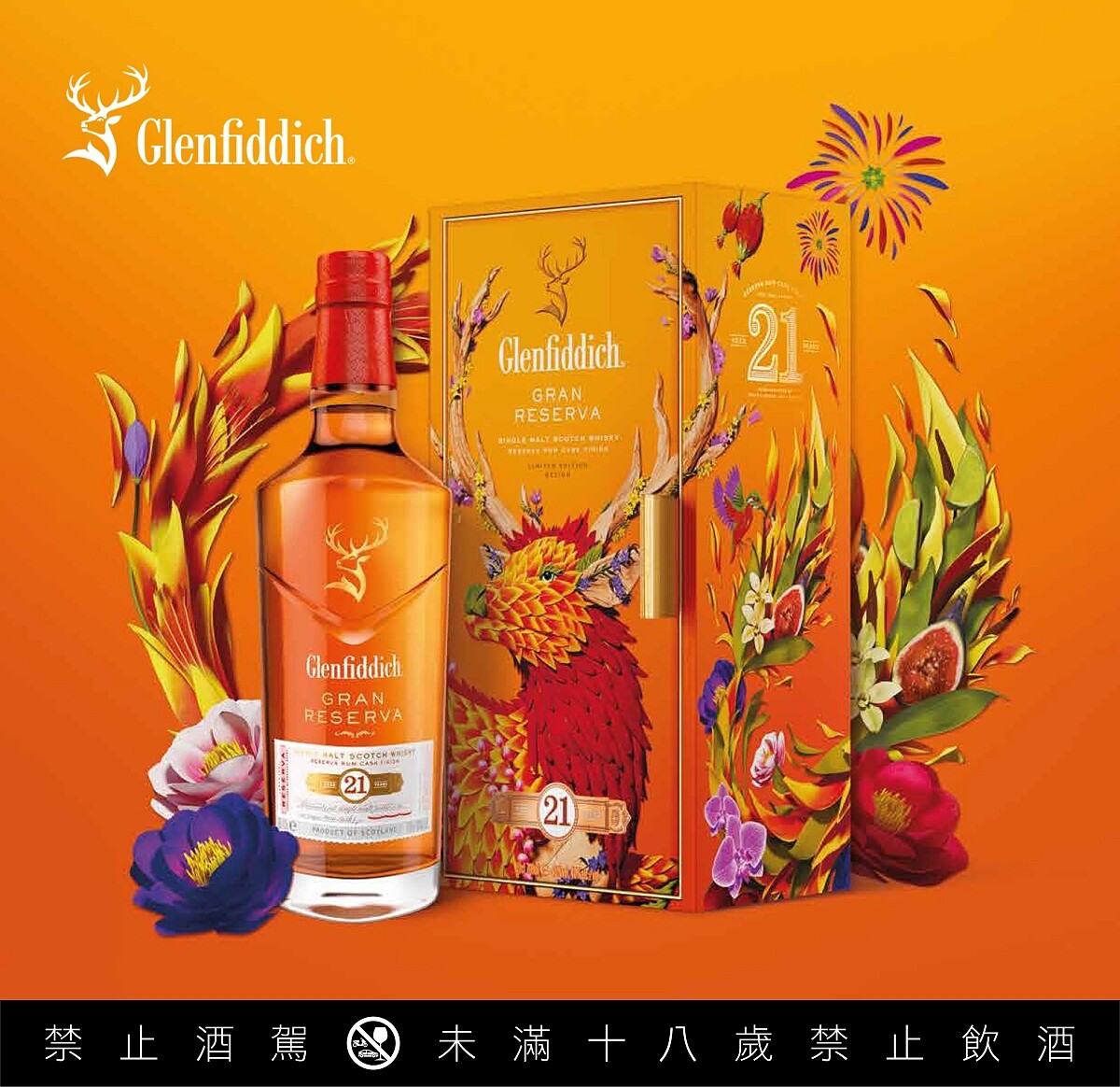 威士忌領路者格蘭菲迪 Glenfiddich 單一麥芽威士忌,全新「格蘭菲迪21年新年限量禮盒」,將象徵「福祿」的「福鹿」意象以盛開繁花和龍鱗表現,將龍年吉祥豐盛滿載濃濃誠意祝福傳遞。內有奢華系列的格蘭菲迪21年,先經歷21年熟成,再換至加勒比海蘭姆桶過桶4個月,完美融合波本桶和蘭姆桶的熱帶水果風味和太妃糖甜味,馥郁的香草甜香、柔和活潑的青檸、生薑和香料氣息,尾韻優雅綿長。