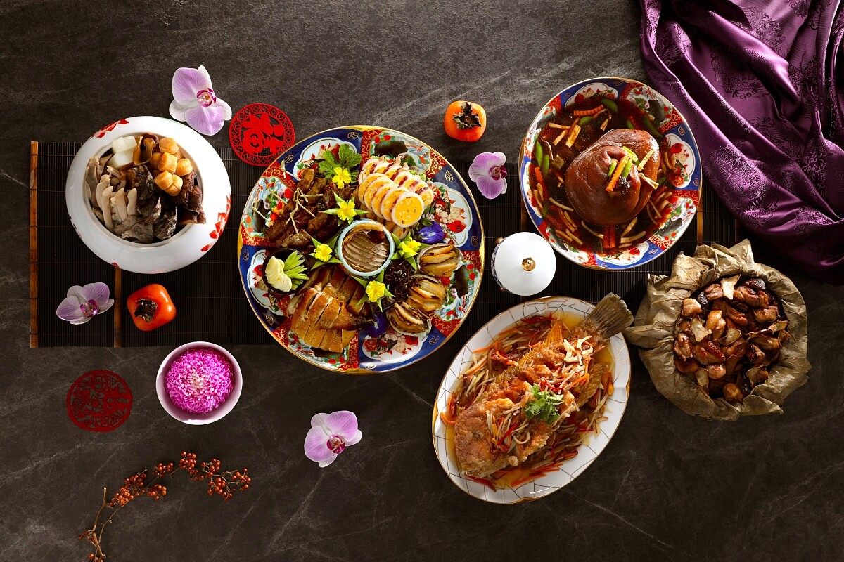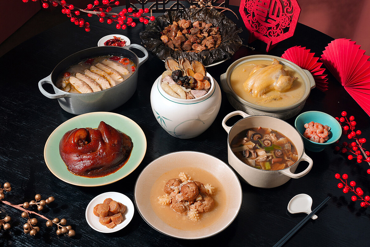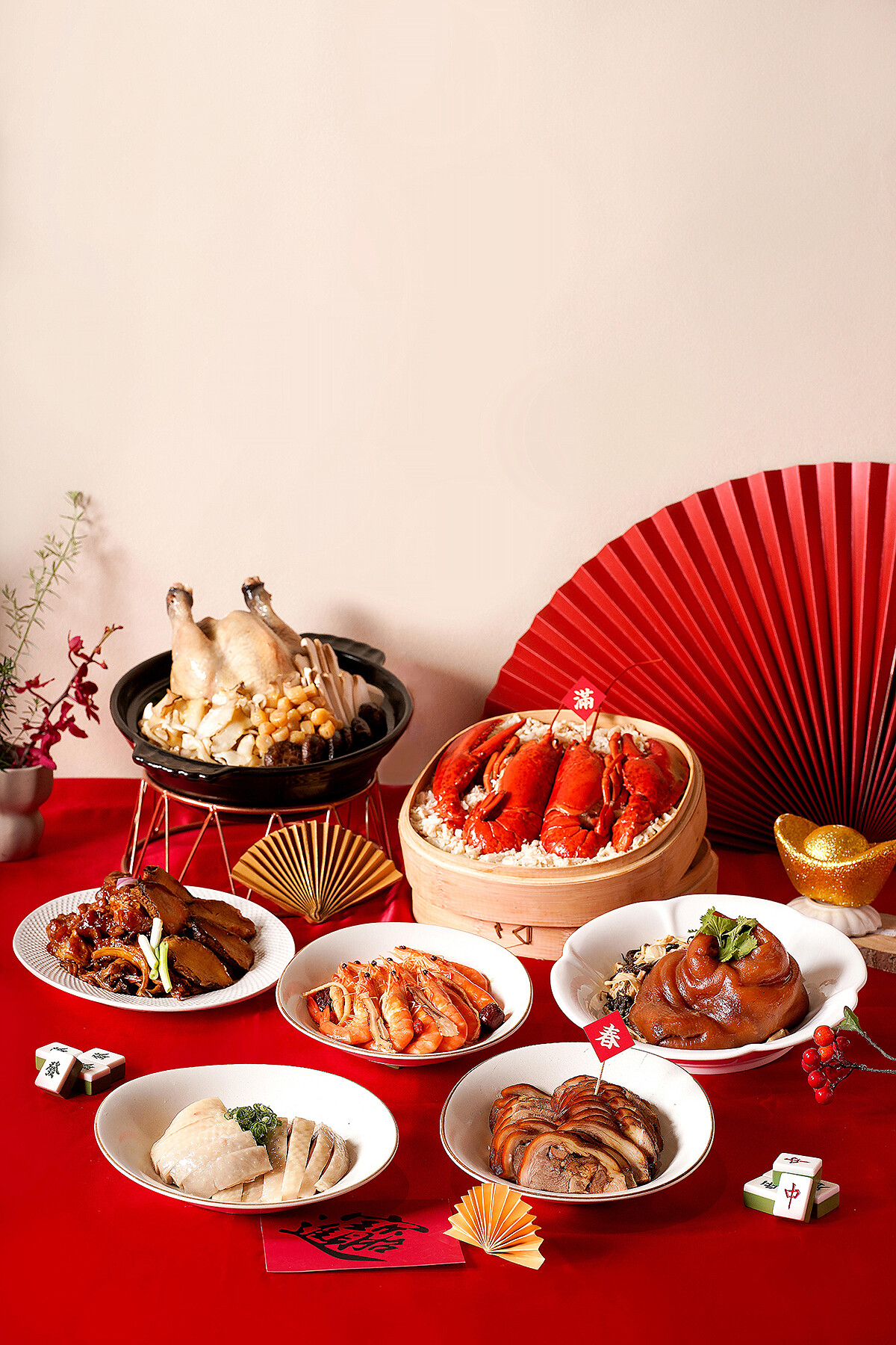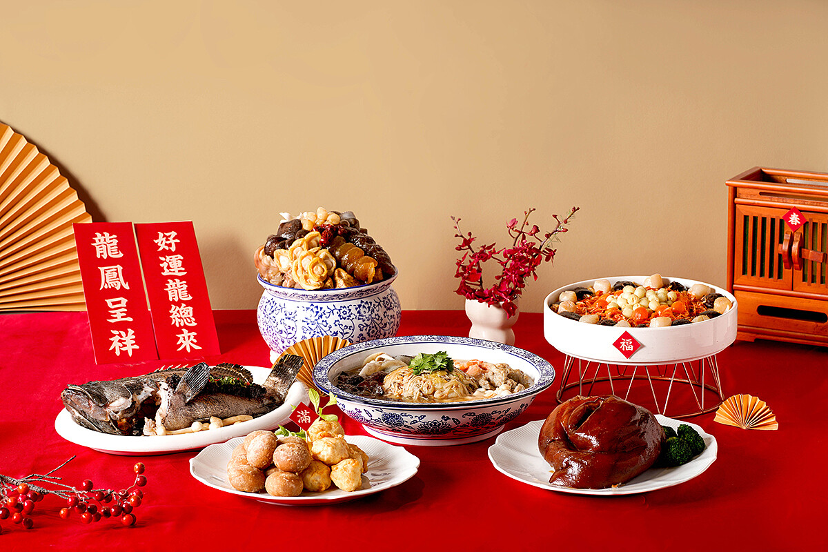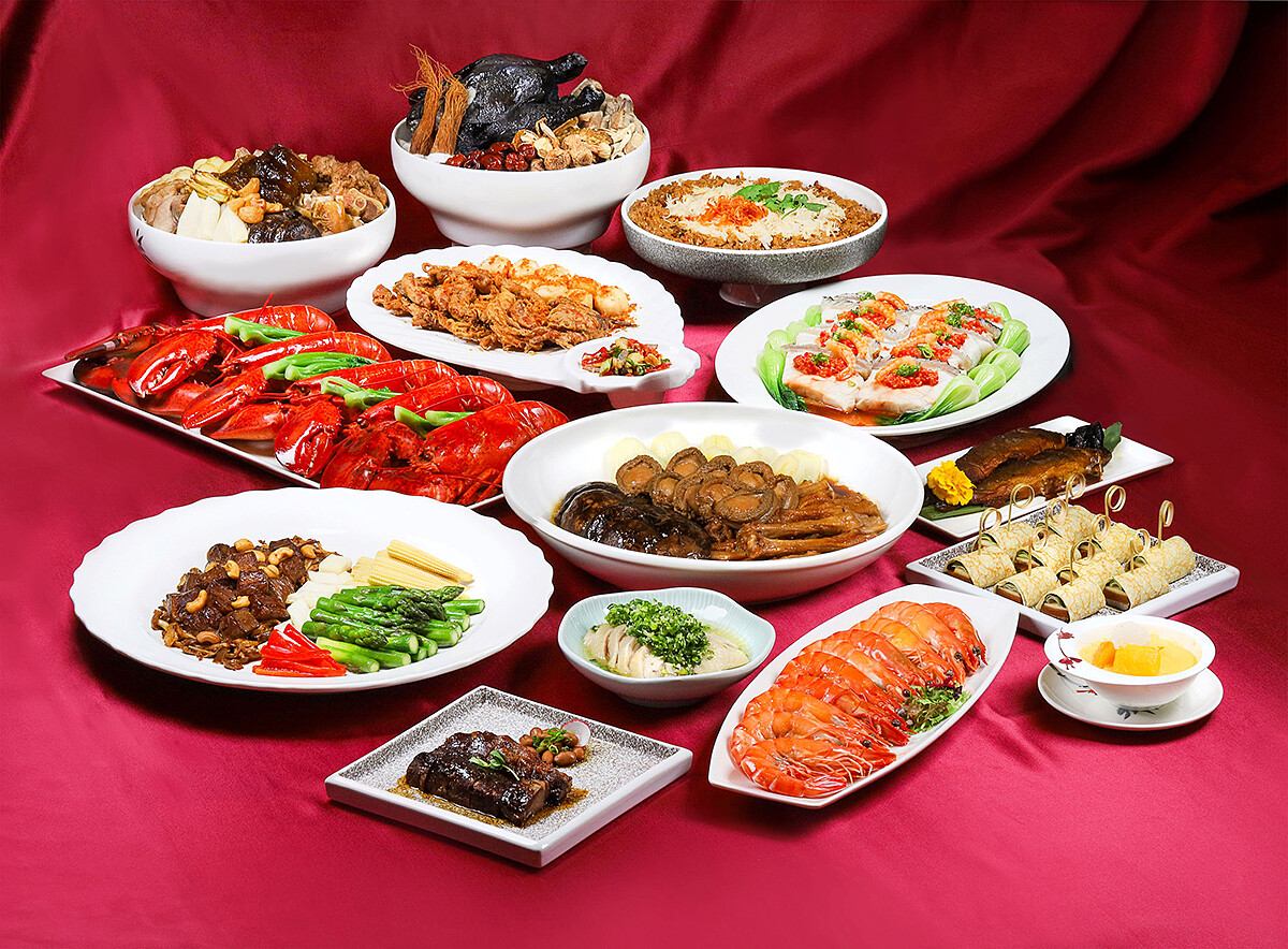 六人份外帶套餐提供七道美味佳餚:「大紅乳豬拼盤」「珍菌六頭鮑魚極品花膠元貝燉雞」「黃金蟲草花雲腿蒸石斑」「酒釀茄干燒澳洲海虎蝦」「鮑汁八頭鮑發菜花菇燴雙蔬」等等。 12道單點佳餚有「廣東盆菜」「黑松露金銀蒜粉絲蒸伊勢龍蝦」「避風塘辣子腰果蝦球」「鮑汁六頭湯鮑鵝掌」「松茸瑤柱鮮菇燴時蔬」,每道價格自NT788元起。