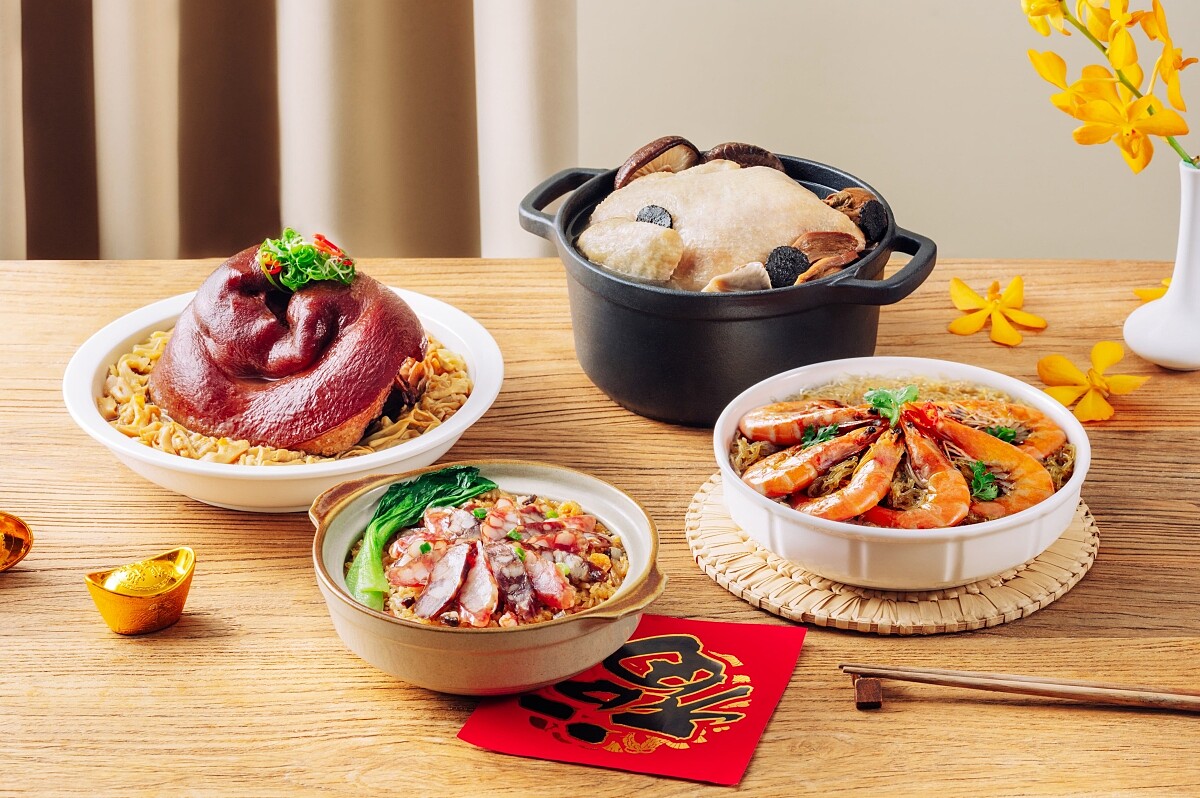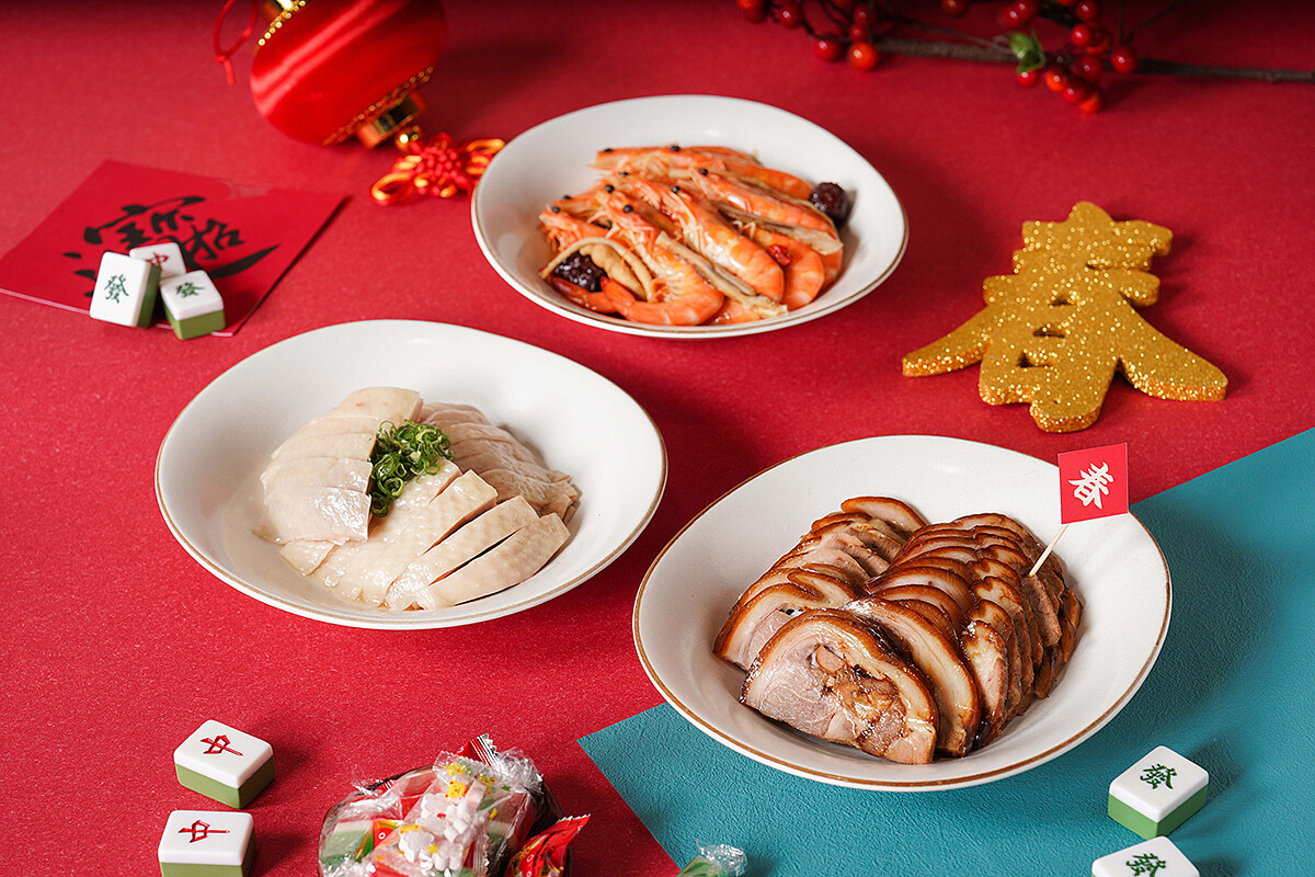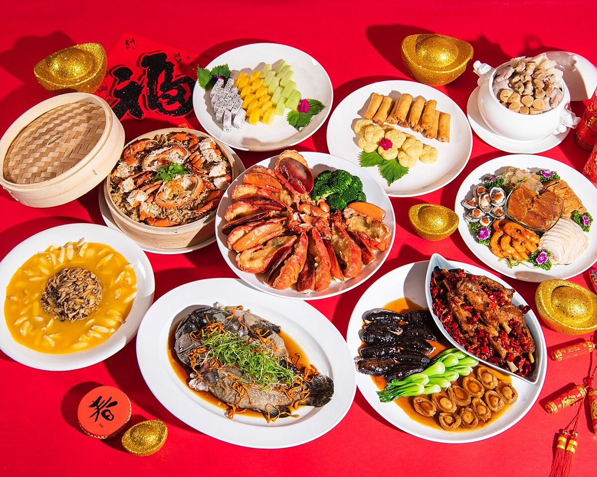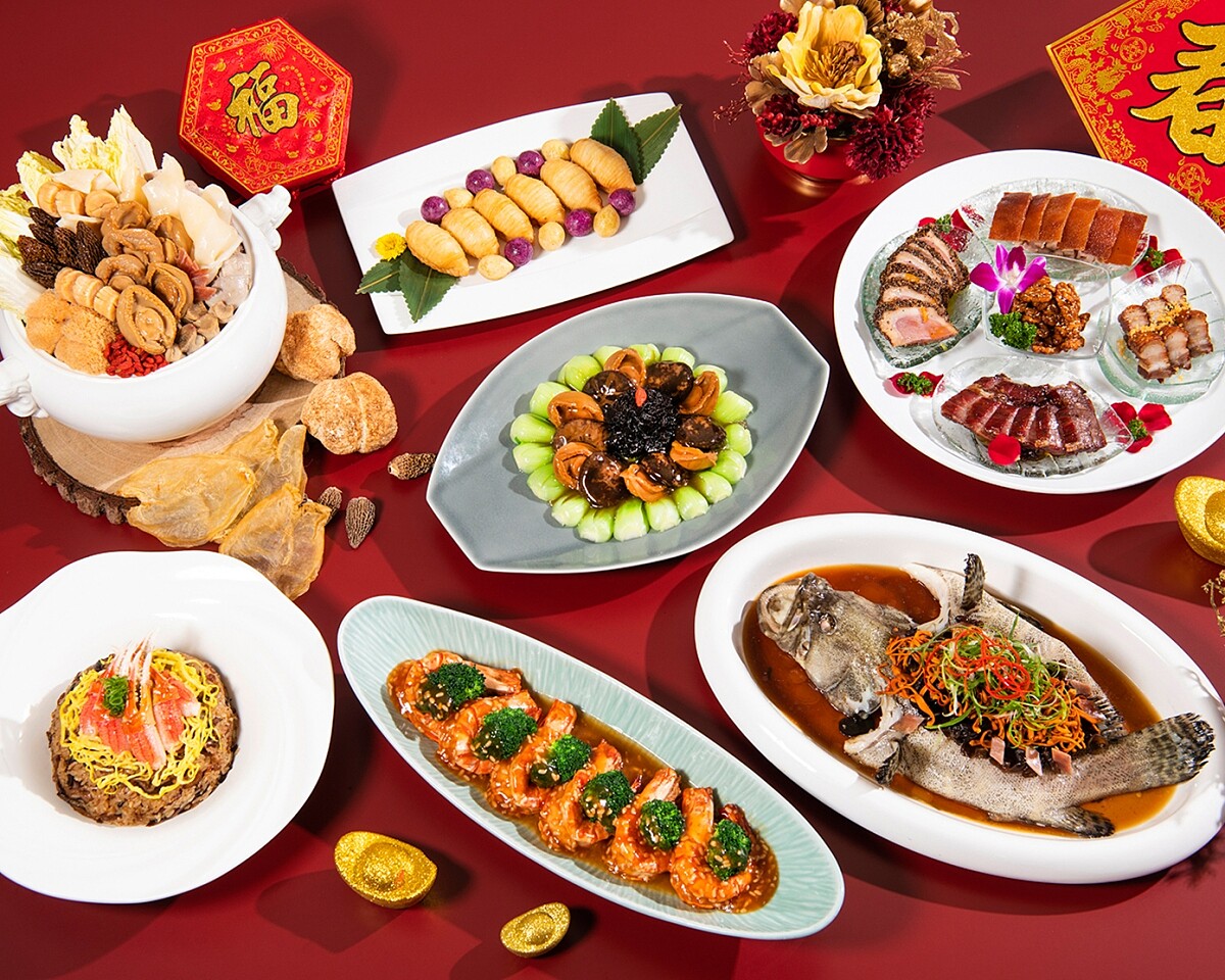 六人份外帶套餐提供七道美味佳餚:「大紅乳豬拼盤」「珍菌六頭鮑魚極品花膠元貝燉雞」「黃金蟲草花雲腿蒸石斑」「酒釀茄干燒澳洲海虎蝦」「鮑汁八頭鮑發菜花菇燴雙蔬」等等。 12道單點佳餚有「廣東盆菜」「黑松露金銀蒜粉絲蒸伊勢龍蝦」「避風塘辣子腰果蝦球」「鮑汁六頭湯鮑鵝掌」「松茸瑤柱鮮菇燴時蔬」,每道價格自NT788元起。