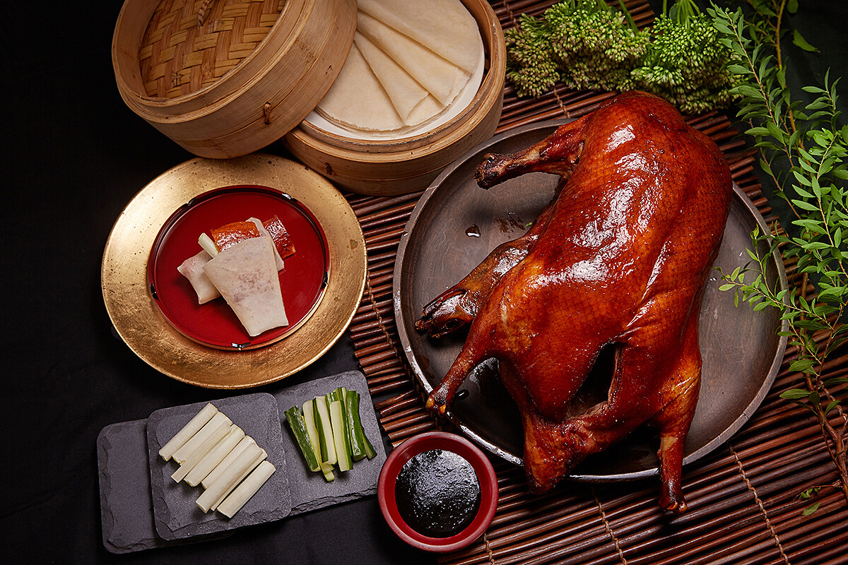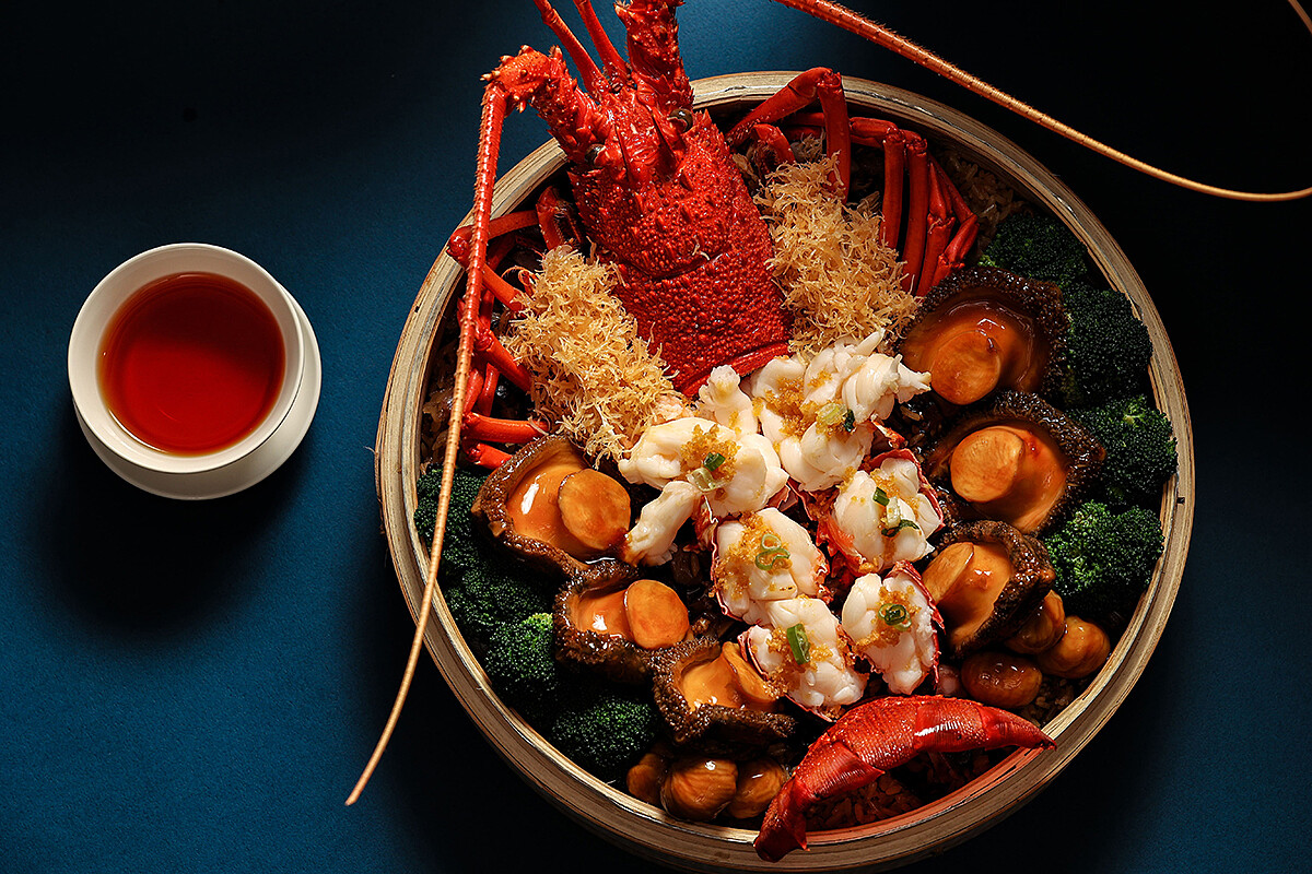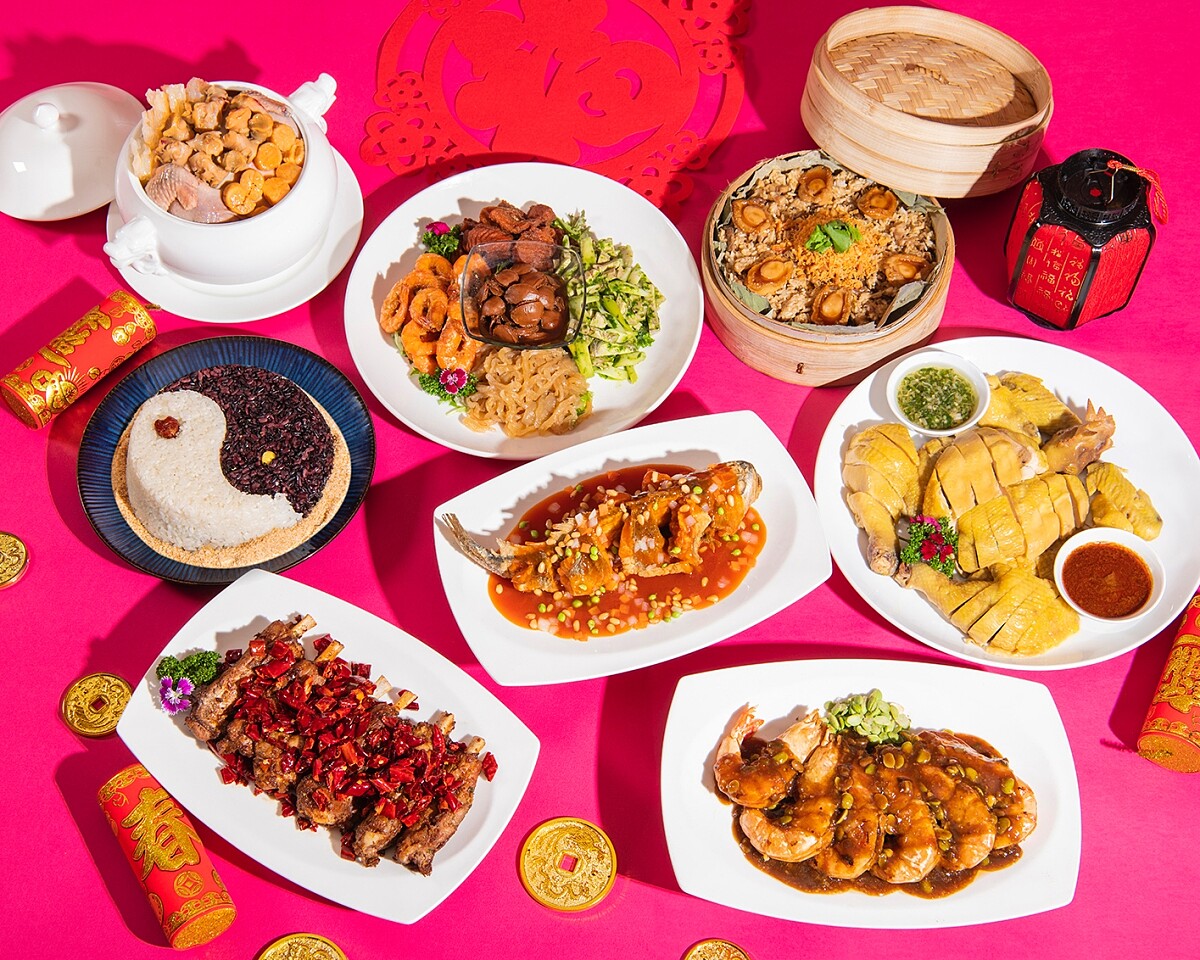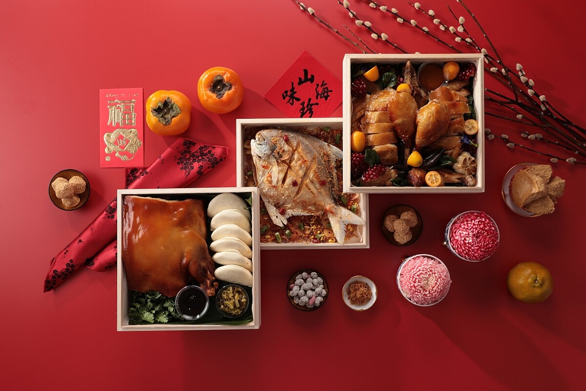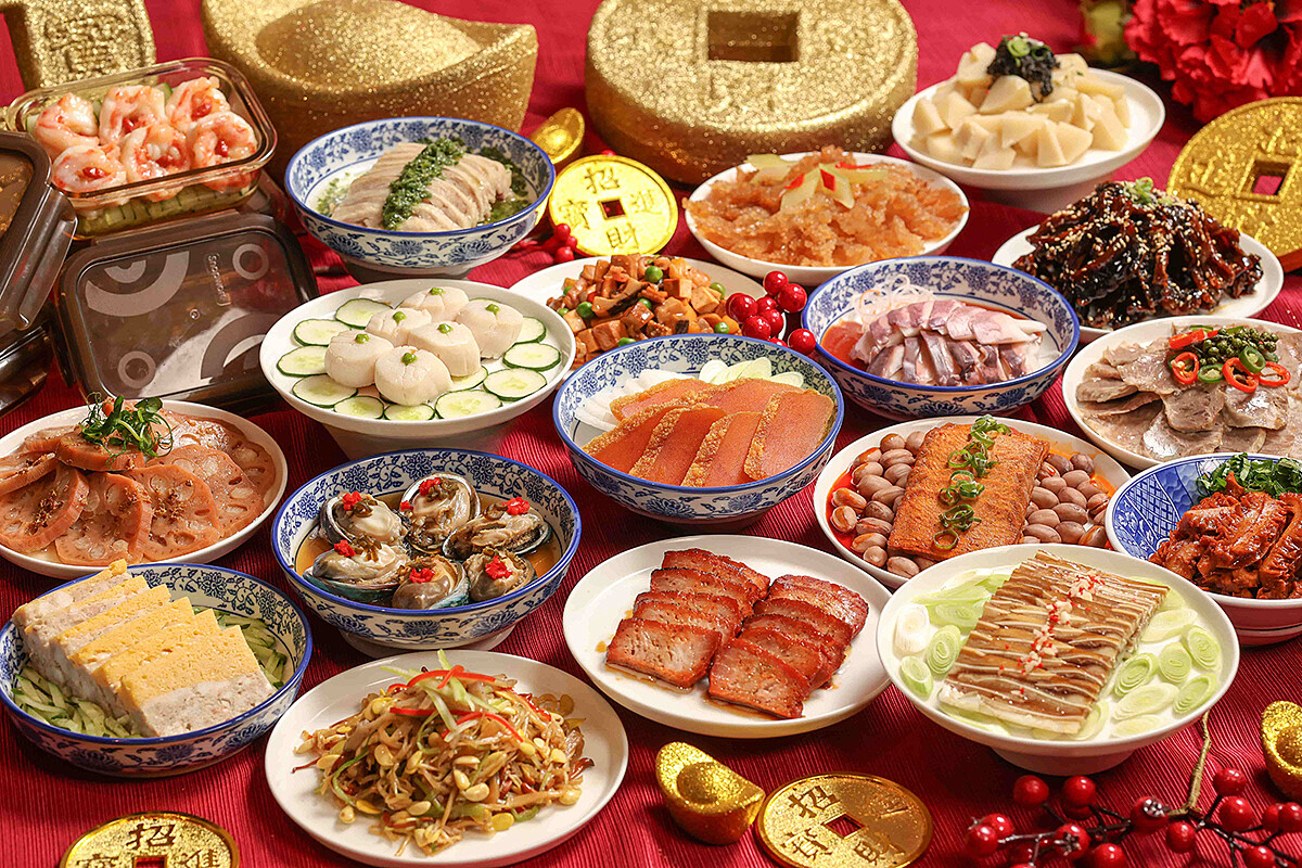 六人份外帶套餐提供七道美味佳餚:「大紅乳豬拼盤」「珍菌六頭鮑魚極品花膠元貝燉雞」「黃金蟲草花雲腿蒸石斑」「酒釀茄干燒澳洲海虎蝦」「鮑汁八頭鮑發菜花菇燴雙蔬」等等。 12道單點佳餚有「廣東盆菜」「黑松露金銀蒜粉絲蒸伊勢龍蝦」「避風塘辣子腰果蝦球」「鮑汁六頭湯鮑鵝掌」「松茸瑤柱鮮菇燴時蔬」,每道價格自NT788元起。