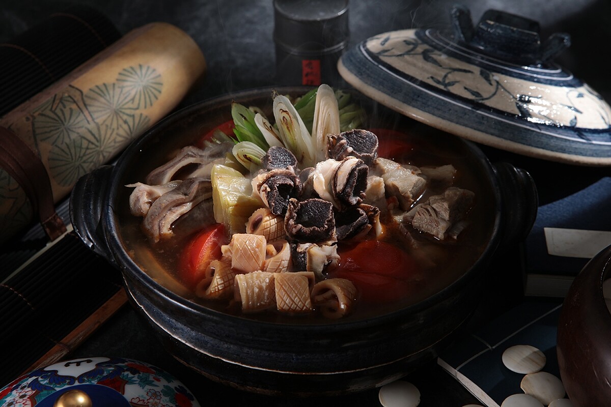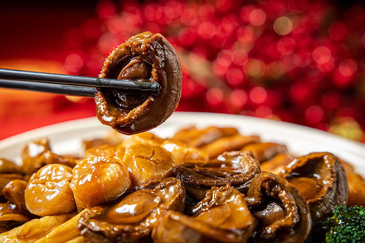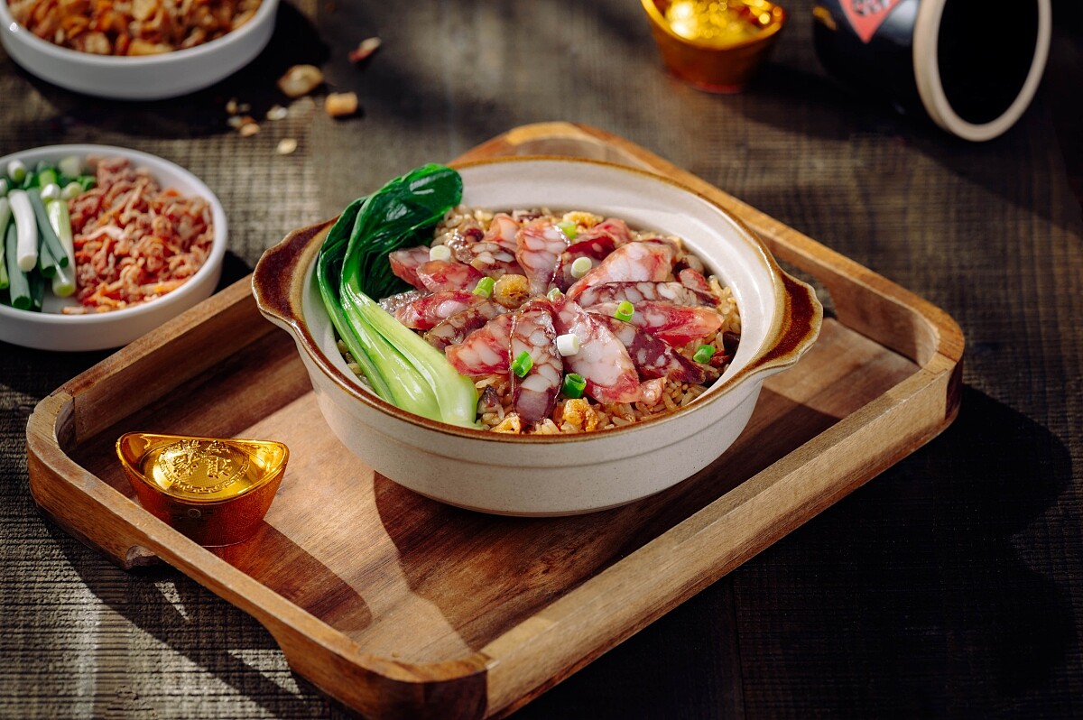 此次嘗試將松露融入傳統年菜,「南法野菌菇燉全雞」選用法式手法熬煮老母雞湯,加入新鮮黑松露、珊瑚菇、秀珍菇、川耳、花菇、牛肝菌等五種菇類,湯頭香醇,雞肉Q彈。「經典粵菜胡椒豬肚雞鍋」則以文火慢煮湯頭,搭配白胡椒香氣清香爽口。菜色中的「避風塘鮮蝦粉絲煲」以十味觀避風塘蟹香蒜酥調味,味道濃郁,結合蟹香、蒜酥、蝦鮮、粉絲的Q彈口感。「港式臘味飯」則選用優質長糯米,搭配正統港式臘肉,香氣四溢,每口都能品嚐到肝腸與臘腸的美味。「富貴筍絲蹄膀」為主廚招牌菜,以特製黃金比例醬汁製作,搭配台灣本產豬後腿肉,肉質Q嫩、筍絲爽脆,呈現富貴團圓的氛圍。