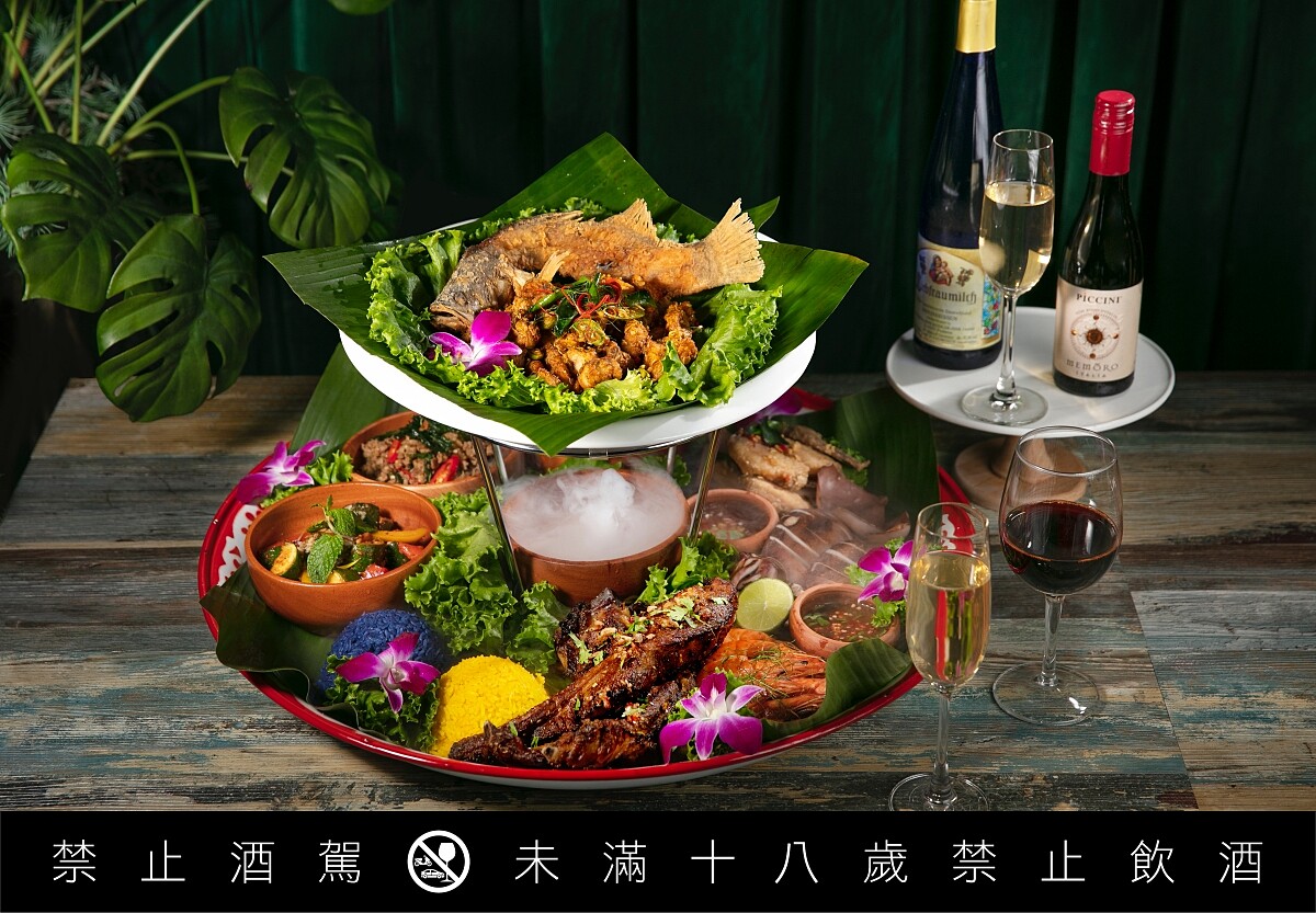 頂層主餐:咖哩滑蛋龍蝦NT3,990元、泰式炸豬腳NT2,990元、香草咖哩炒鱸魚NT2,990元、香辣炒鱸魚NT2,990元。 底層拼盤配菜:打拋豬、青木瓜涼拌、泰式櫛瓜、炸雞翅、香爆豬肋排、酸辣鮮蝦、炙燒鮮魷、蝶豆花飯、薑黃飯。