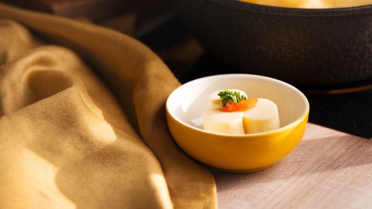 主廚為本次雞湯料亭獨家研發的私房鍋料,精緻如法式小點,滿口蛋黃香氣之外,卻在濃郁風味之下保持純淨口感,加價59元。