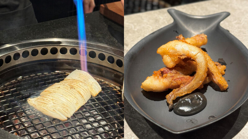 另外一道 「野生軟絲」則是選用澎湖產野生軟絲,炙燒出表面微微金黃,吃起來肉質厚實Q嫩,還有酥炸版的軟絲腳足,搭配鹽麴、蒜頭、及軟絲墨汁調製的醬汁,超適合當作下酒菜啊!