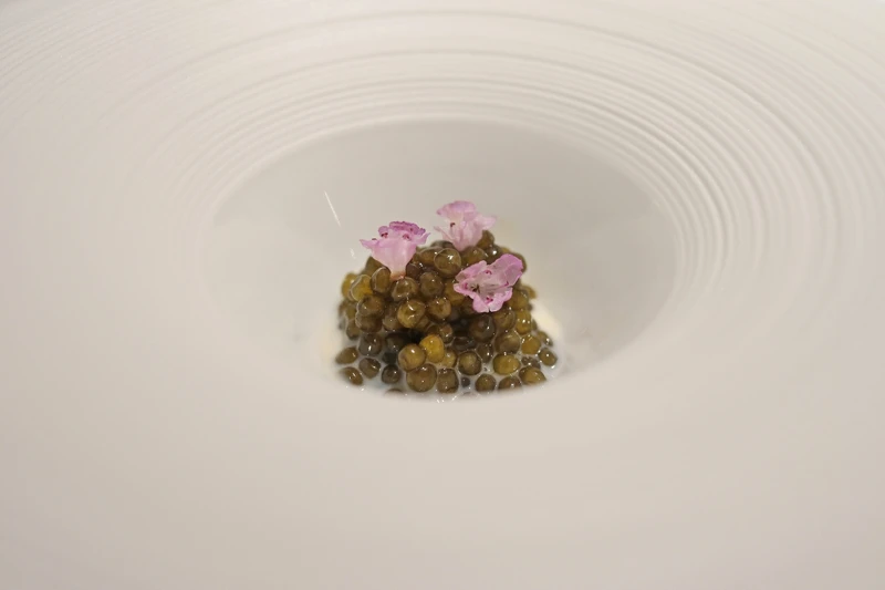 選用來自甘肅、入口具有堅果與奶油香味的鱘魚子醬,純淨的海味與纖細顆粒口感,搭配香氣馥郁的芝麻泥與芝麻奶,再點綴上紫蘇花瓣,延伸魚子醬細膩悠長的風味。