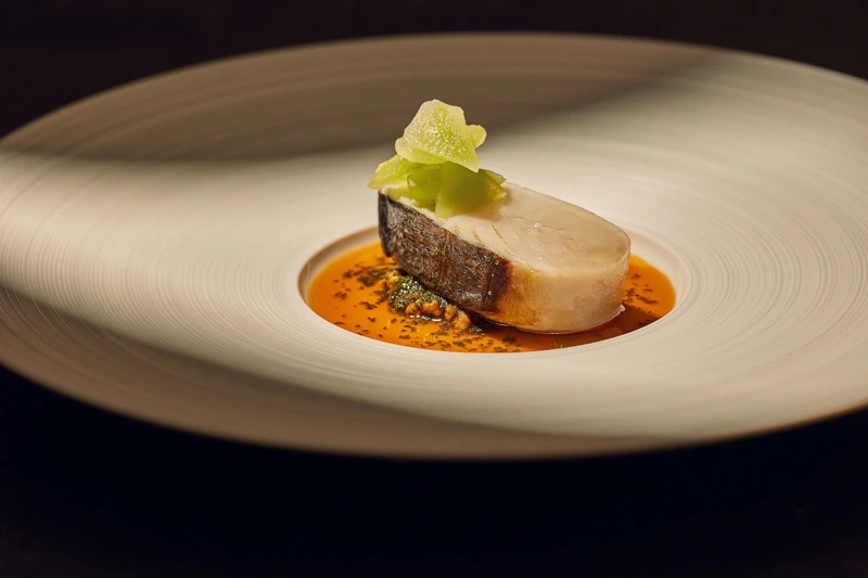 選用肉質肥美、口感結實富有嚼勁的Gillardeau二號牡蠣,滋味細膩且豐富,底層鋪墊調和雪莉醋製成的牡蠣乳化醬汁,一起包裹在炙烤過的發酵甘藍葉中,佐上以白脫牛奶為基底加入新鮮山葵、蒔蘿的醬汁,整體呈現簡約洗鍊,層層堆疊的風味更襯牡蠣迷人的海潮鮮味。