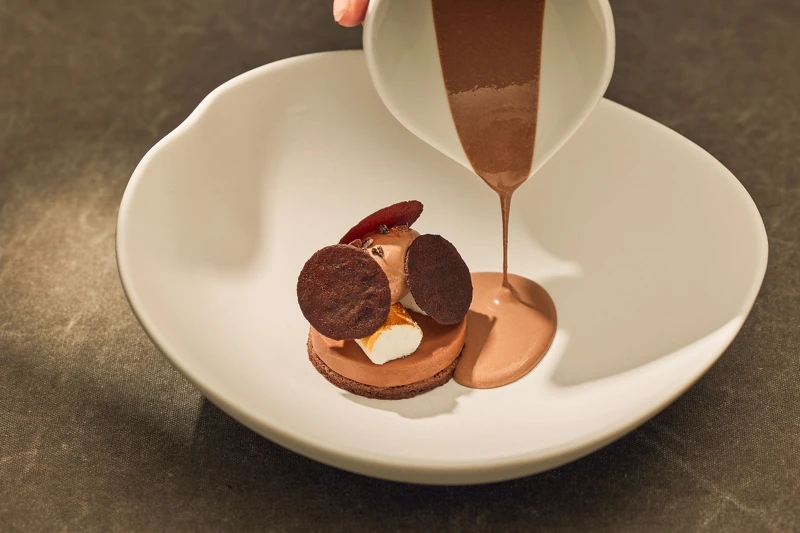 在餐盤裡,將巧克力拆解成五種不同的質地元素!全面採用果酸及花香氣濃郁的聖多明尼克70%巧克力製成,層層堆疊雪酪、慕斯、蛋糕及脆片,最後淋上巧克力醬汁,再搭配自製的蛋白棉花糖,細細感受巧克力不同的風味體驗及面貌。