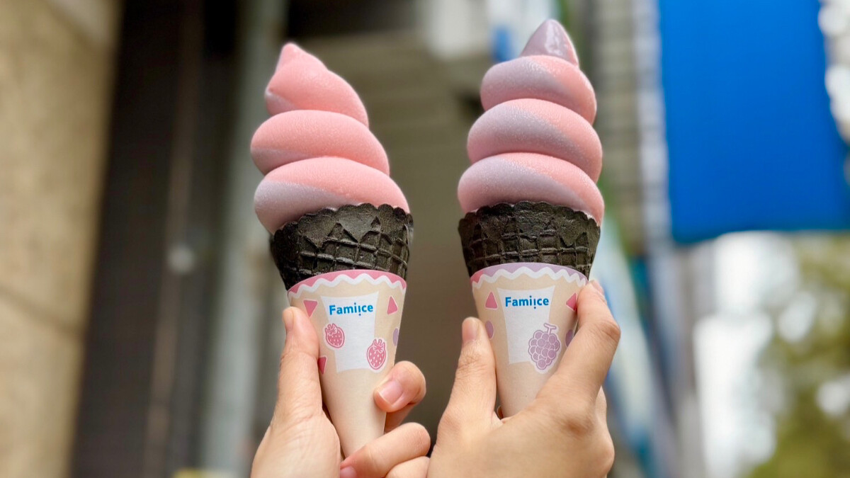 Fami!ce不但把去年熱賣的暢銷口味「草莓優格」霜淇淋再度回歸,還加碼推出「巨峰葡萄」霜淇淋,粉紅色配上紫色真的讓人看了愛不釋手。「草莓優格霜淇淋」使用新鮮草莓果汁融合優質優格原料製成,而且今年使用的草莓果汁比例是去年的加倍,所以草莓味更加濃郁。「巨峰葡萄霜淇淋」則是使用日本山梨縣進口巨峰葡萄果汁製成,將甜味與酸味達到完美平衡。