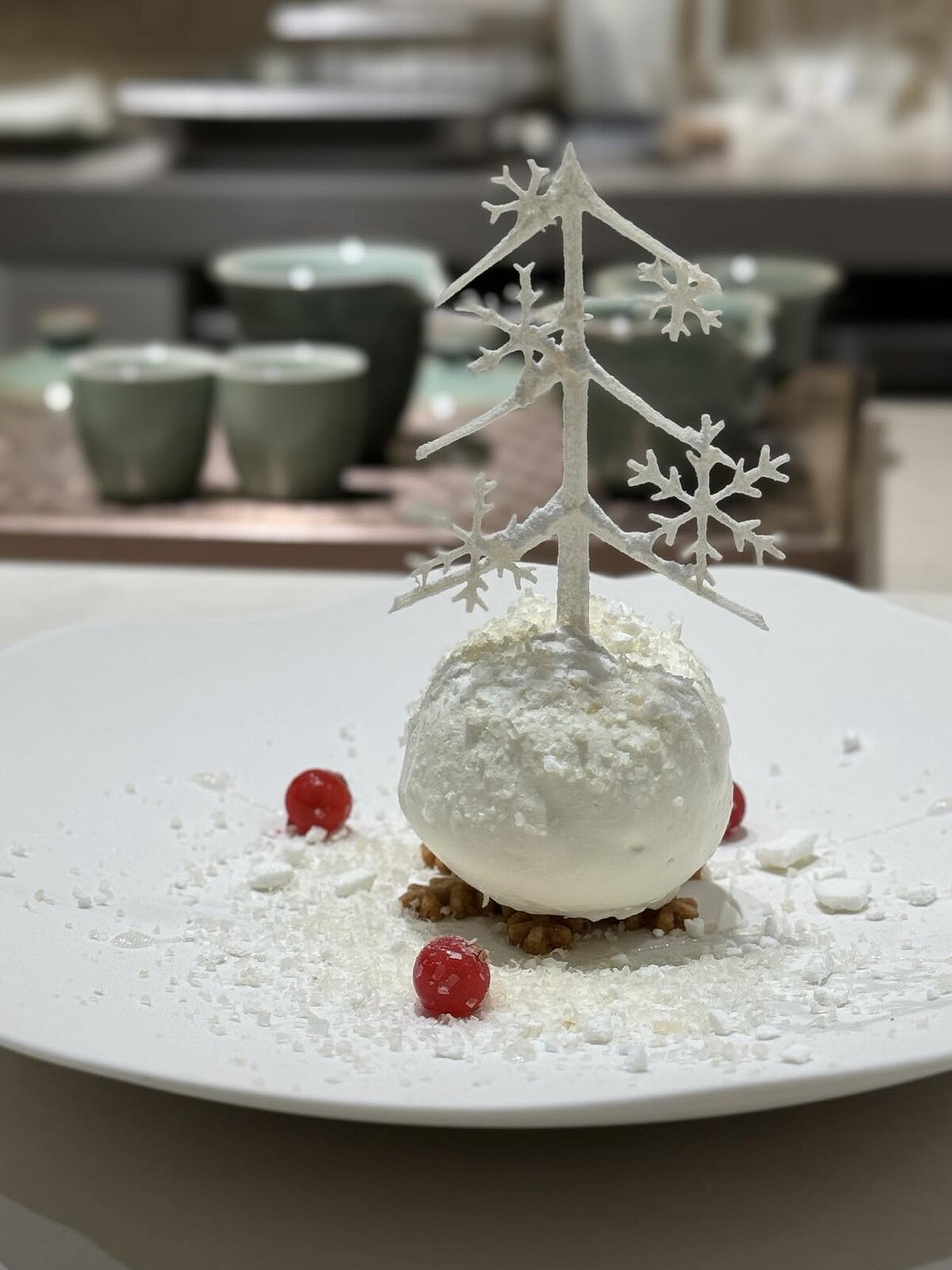 此外,還有充滿雪景氛圍的「冬季盆栽」,是主廚平塚牧人的經典甜品酒釀起司蛋糕,以雪球的樣貌呈現,最後現場撒上蛋白餅與夏威夷豆做成的雪花,實在是夢幻破表,肯定又是相機先食。