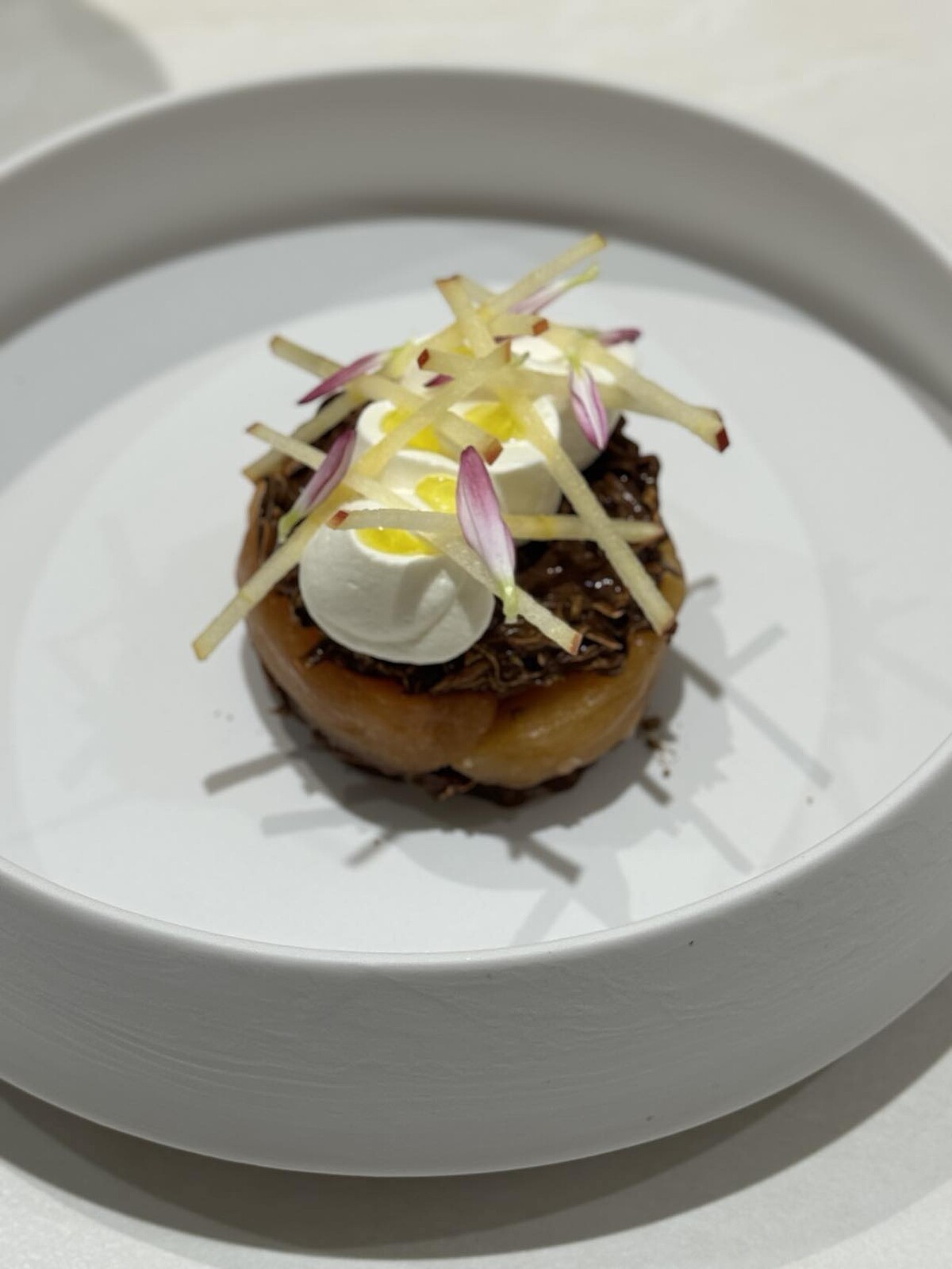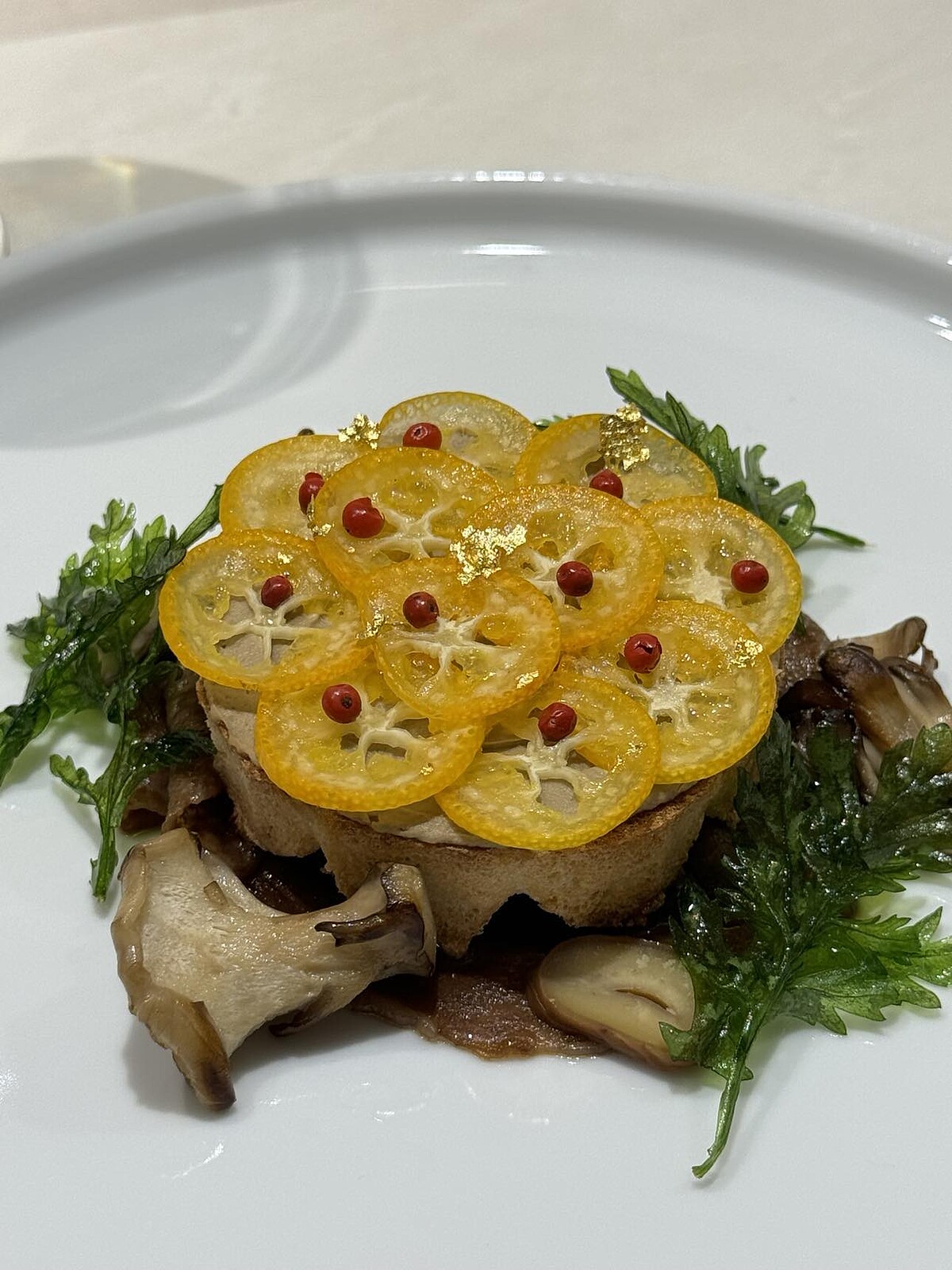 這次最驚喜的想必是「和牛咖啡達克瓦茲」,主廚平塚牧人創造了世界上第一個和牛甜點,將兩個難以想像搭配的品項結合,將達克瓦茲塔疊在熱騰騰的壽喜燒牛肉上,軟嫩的肉質與達克瓦茲驚喜融入,上頭的柑橘金橘則降低了油膩感,是必須要一嚐的甜點新滋味。