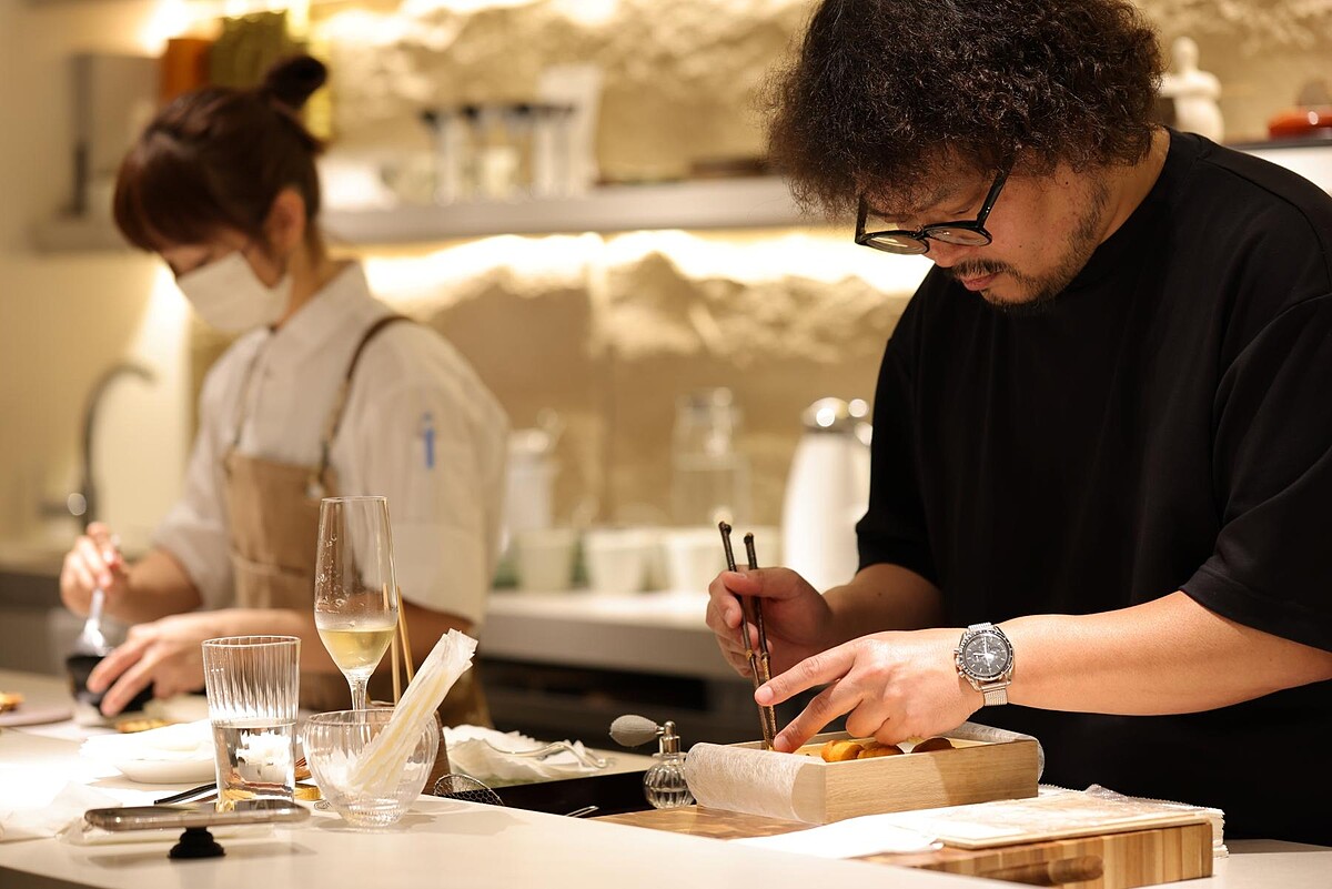 「我最不想做的,就是一道好吃、卻沒有創新的甜點。」主廚平塚牧人憑著這份信念,同樣在本季的菜單玩出趣味,這次的菜單包含開胃菜共有8道品項,以讓客人自己拿取「橄欖樹」為開端,搭配Nick的「Mood Pairing」首杯Mood Tea Ni,有著蓮霧清新的香氣打開味蕾。