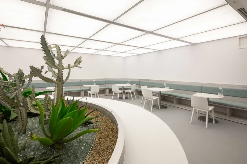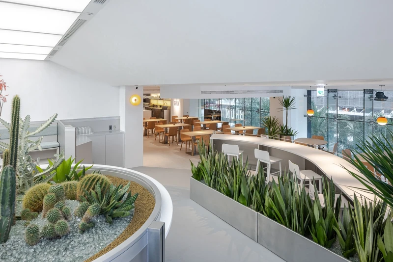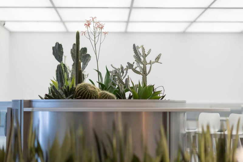 為空間帶來清新柔和的植栽也是品牌一直以來的特色之一,找來擅長花卉、複合媒材創作的花藝設計師「感官花子 Sensual Flower Point」,統籌規劃室內庭園,透過綠意植栽搭襯上空間大量金屬材質、幾何造型構造,讓整體氛圍表現出城市生活中的時髦感。