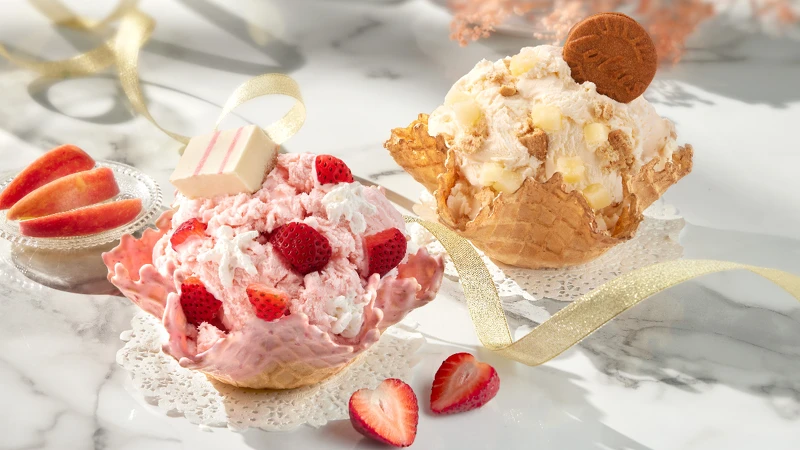 「濃情美莓」酷聖石草莓冰再升級,人氣No.1酷聖石草莓冰淇淋加入嚴選天然水果製成的無添加果醬製成「濃草莓冰淇淋」,拌入新鮮草莓、鮮奶油,最後擺上一整塊乳酪蛋糕,是甜點控絕對不能錯果的美味。
