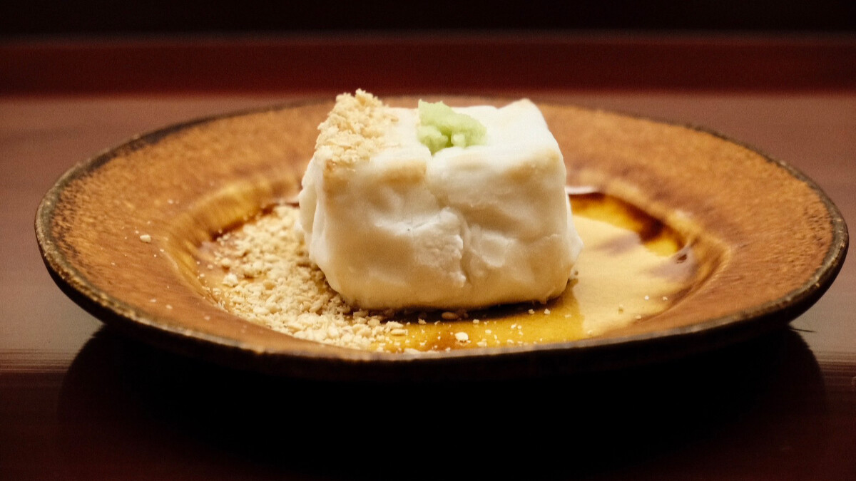 需費時4天才能完成,不僅考驗師傅的經驗與手藝,製程更是耗時耗力,使用日本脫皮白芝麻,加上天領水與利尻昆布浸泡一個晚上,研磨後加上葛粉,手工細打、將空氣打進去,所以能吃到有如白子蓬鬆、綿密的口感。出餐前需再由細火炙烤,表皮帶有微微焦香,口感柔嫩、外酥內軟。品嚐時可以先吃原味,一旁的沾醬口味清爽,醬油不會死鹹,是小田料理長的招牌菜之一。