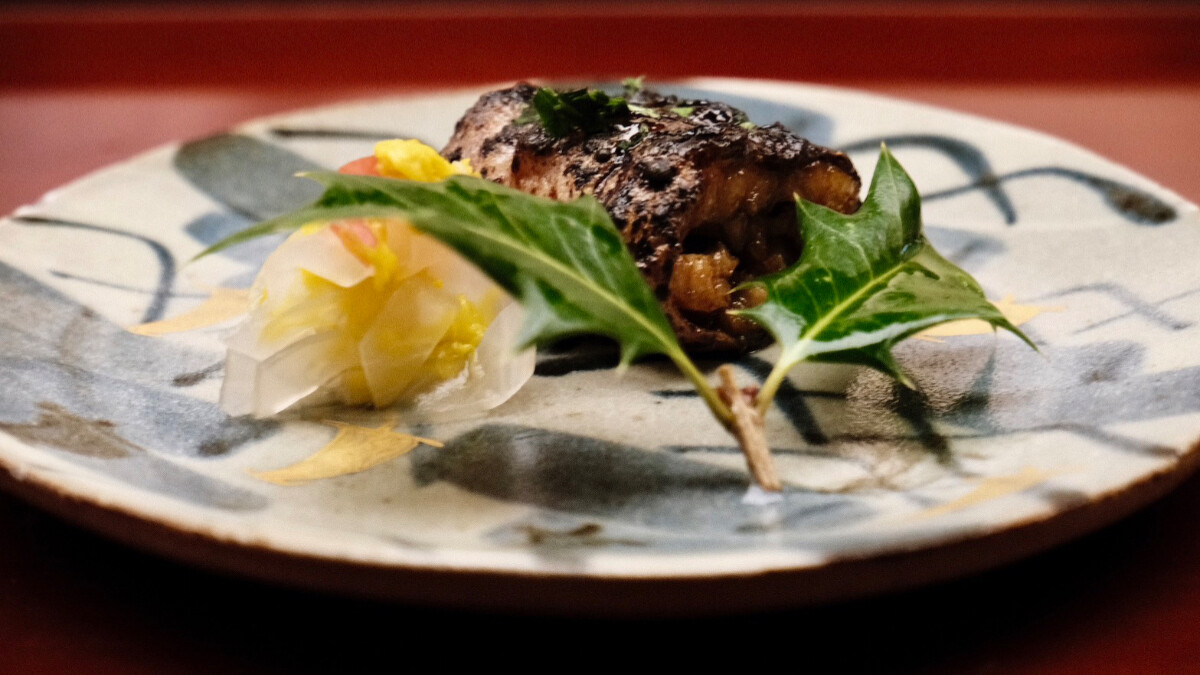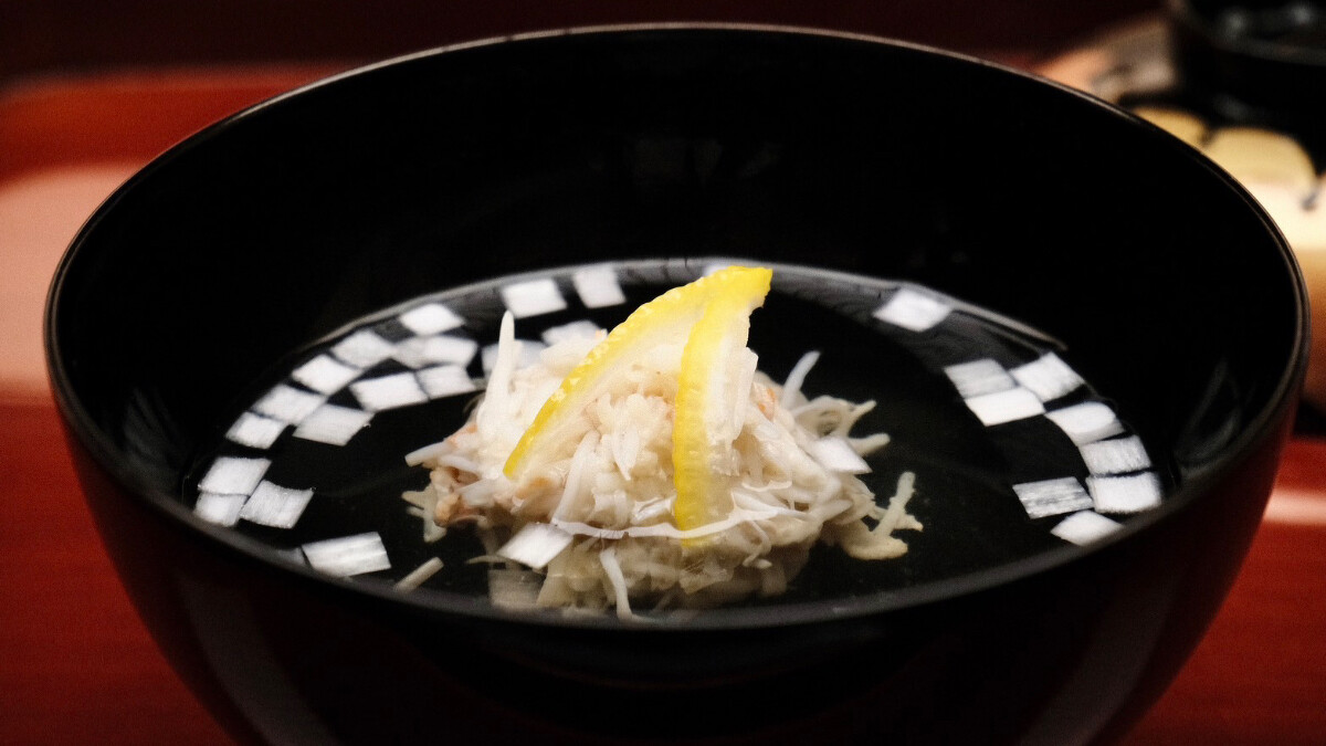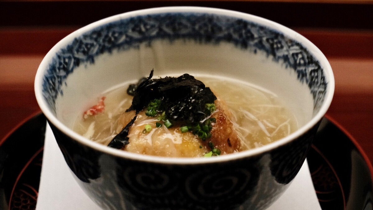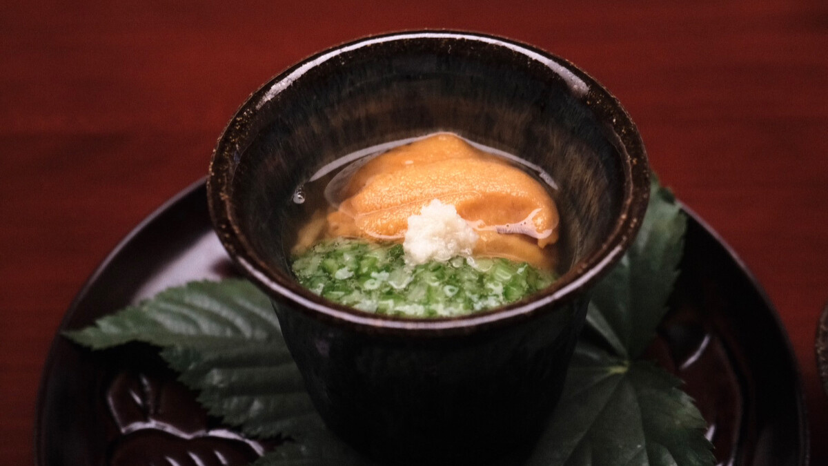 將日本山藥切絲如麵,冰鎮後淋上枯本節及利尻昆布熬煮的高湯,芡汁使用自製高湯和秋葵泥,因此嘗起來鮮甜又滑潤,又不似羹湯那樣容易膩口,非常清爽。再搭配入口即化的海膽以及香氣清新的紫蘇花穗,無論視覺、嗅覺還是味覺都大大滿足。