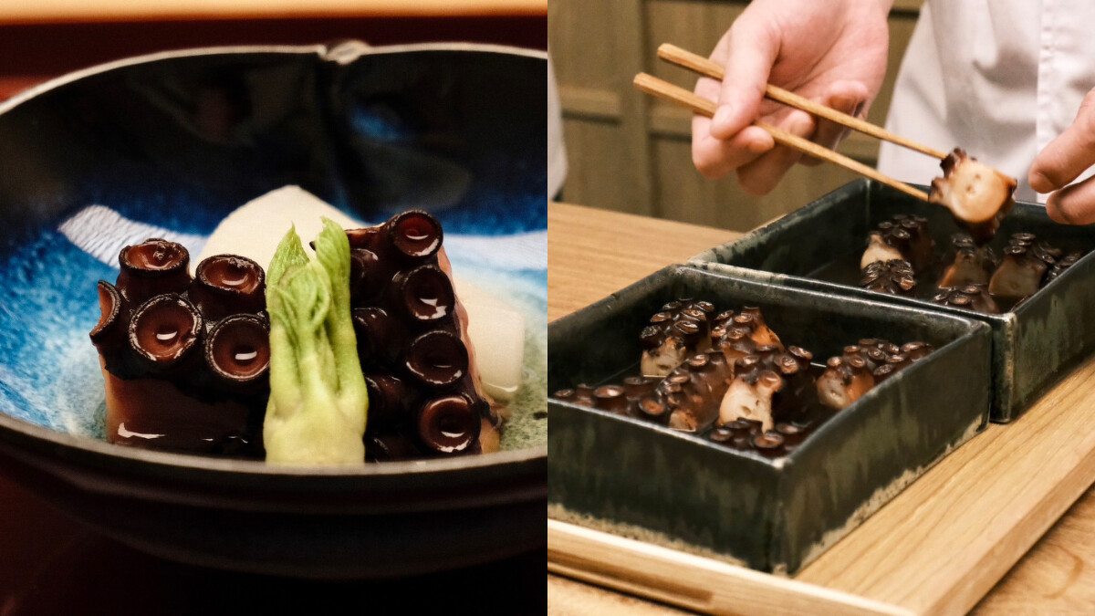 使用來自熊本的章魚,在高湯中低溫慢蒸4小時,達到入口即化的口感,整個蒸煮過程溫度不超過90度,因為若是超過適當溫度,章魚氣孔打開會導致肉質變硬。