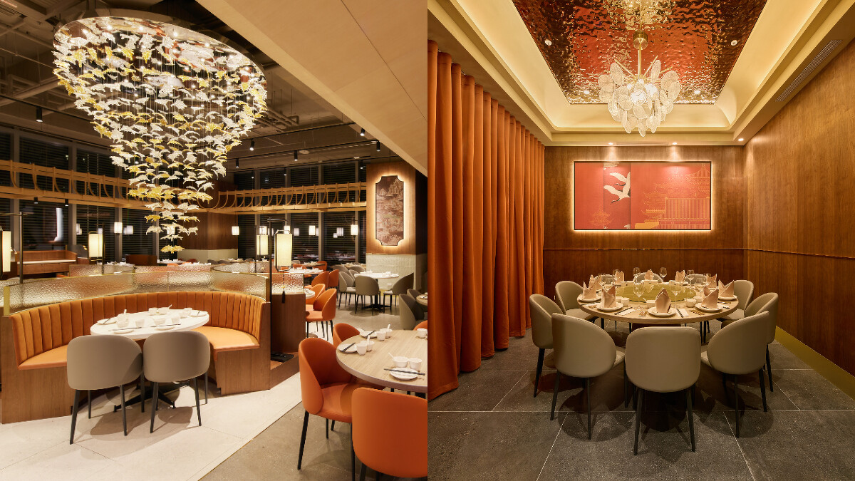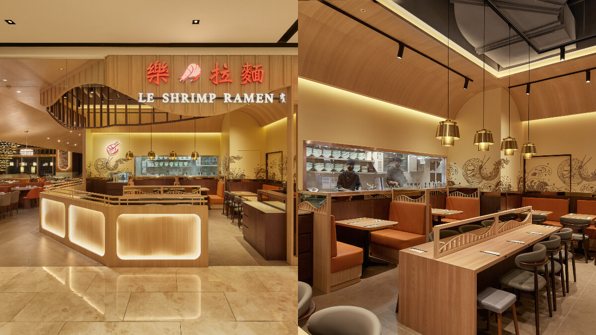 新加坡樂天餐飲集團在台首間雙店面空間由知名設計公司「號外制作所」操刀,從入口左進的「樂天皇朝」以小籠包源起年代「宋朝」為靈感,整合橘紅及溫潤的木色為主色調,搭配立體的巨型落葉吊燈,復古東方情調與現代幾何元素並存。入口右側的「樂蝦拉麵」則以溫暖明亮的燈光、清爽白木色系和線條活潑的手繪風壁畫打造年輕風格,與樂天皇朝的溫煦自持勾勒出「交界」主題感。