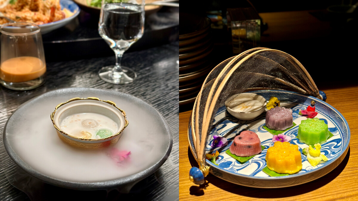 Jimmy的料理更有一大特色,便是「浮誇擺盤」,考究宮廷菜系中「擺盤」能味佳餚提點視覺效果,從前菜「暹羅綜合盤」便展現出他長時間練習蔬果雕刻的成果,細細品嚐帝王蟹時蔬捲、北海道干貝鮭魚卵、酸辣鮑魚、酥炸龍蝦肉捲之外,更有用鹽雕手工製作成「瓦」形佛寺;「綜合甜點盤」在繽紛色彩道地小點裡,也以帶有傳統風格的器皿盛盤,是名符其實的視覺、味覺雙重饗宴。