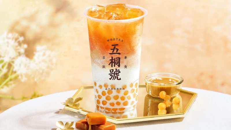 本季最受矚目的靈魂配料「妃」它莫屬,五桐號獨創的「太妃珍珠」,特別採用100%北海道生乳,結合奶油與焦糖,人工慢火熬煮的太妃醬包裹著白玉珍珠,蜜漬後的太妃珍珠泛著剔透金黃色澤。顆顆飽滿Q彈,經過五大要訣「沸、倒、燉、燜、拌」,讓濃醇奶香在嘴裡層層化開。柔滑不膩口的口感最適合搭配「奶茶」系列,尤其是全新上市的「蜜春后奶茶」更是國師欽點的最佳組合!