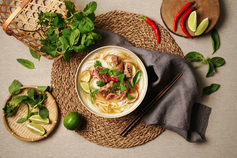 湯頭汲取法國牛肉蔬菜鍋(Pot-au-fe)靈感,將牛腩與牛筋牛骨、洋蔥及薑等多種香料一同熬煮,更可享受到牛腩肉香及牛筋膠香,兩種肉質一碗滿足,湯頭、口感有別於市售任何一款牛肉麵。選用進口越南粉(河粉)中較細的米線,手工古法及日曬製作,容易吸附湯汁,吃起來更入味。